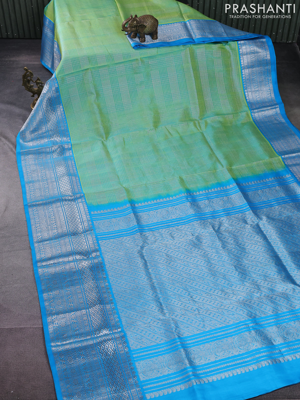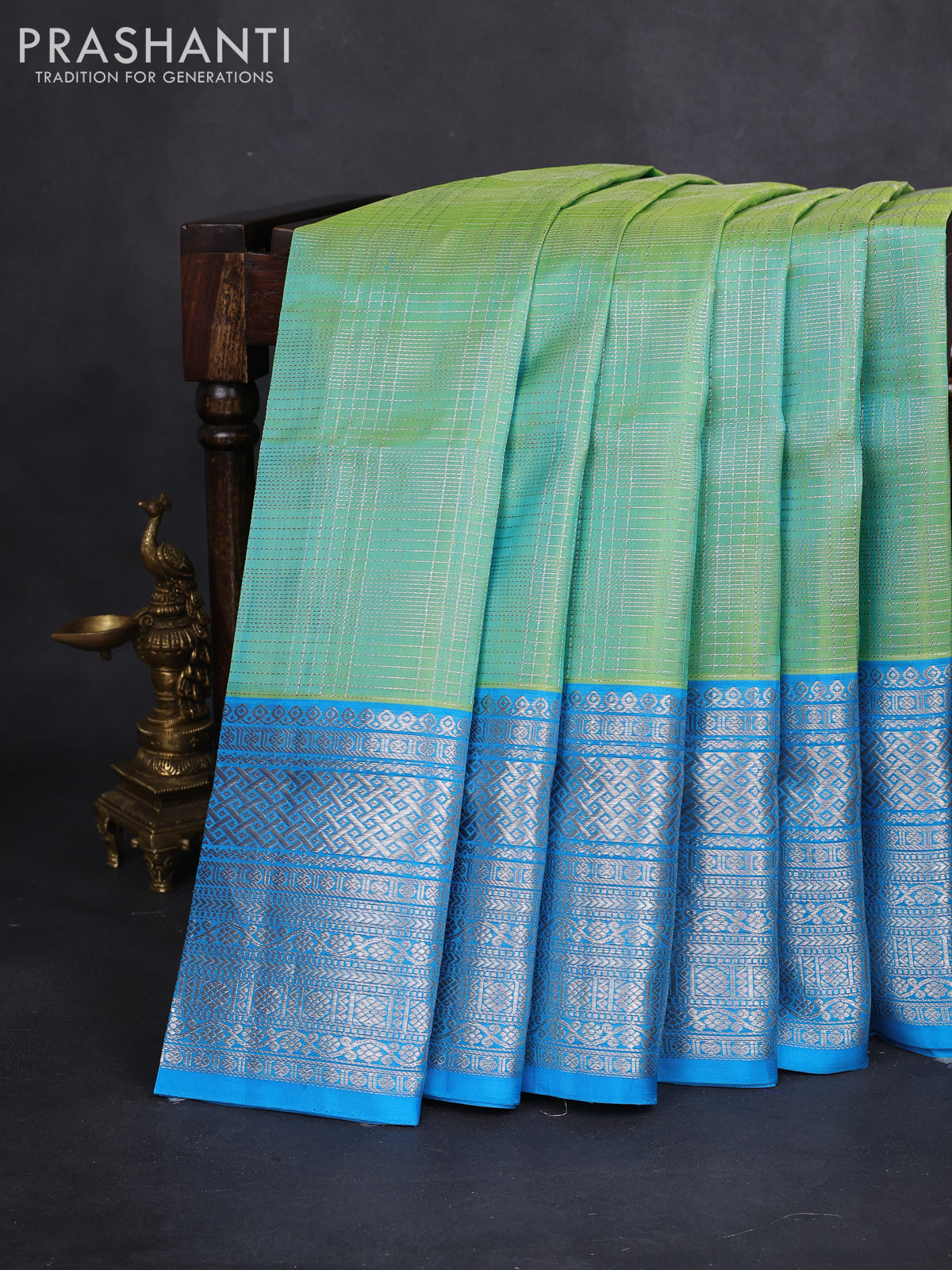 Venkatagiri silk saree teal green and cs blue with allover silver zari checked pattern and silver zari woven border