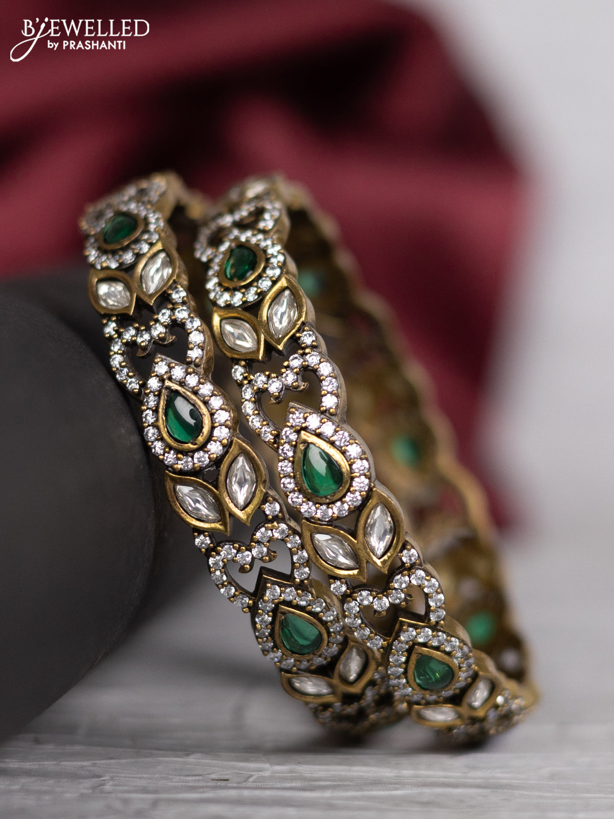 Victorian finish bangle with emerald & kundan and cz stones