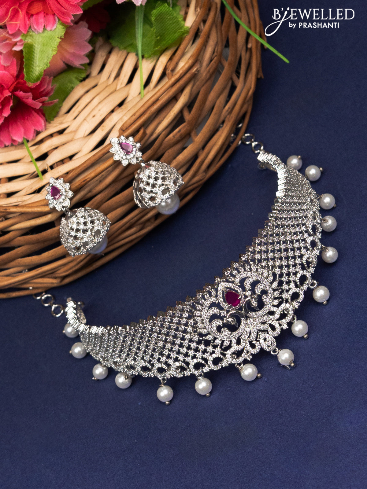 Zircon choker peacock design with ruby & cz stones and pearl hangings