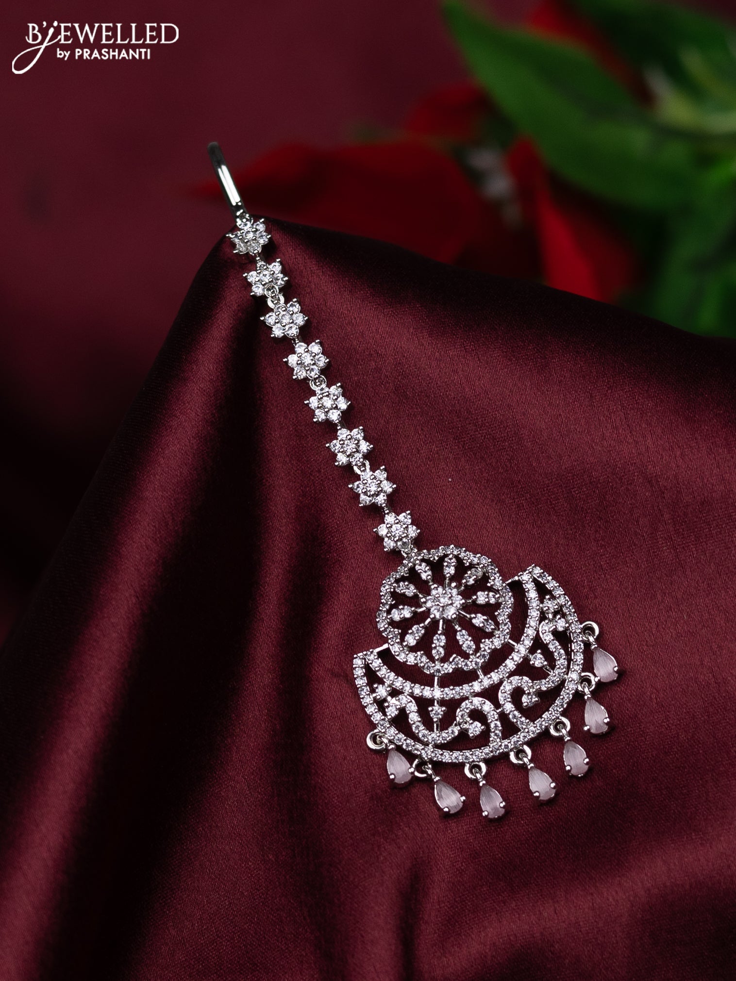 Zircon maang tikka floral design with baby pink & cz stones and hanings