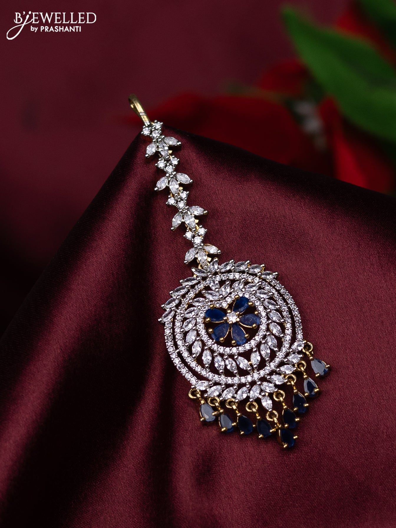Zircon maang tikka floral design with sapphire & cz stones and hanings in gold finish