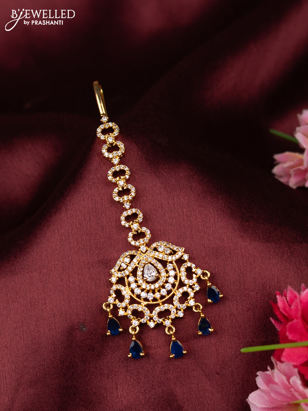 Zircon maang tikka with sapphire & cz stones in gold finish