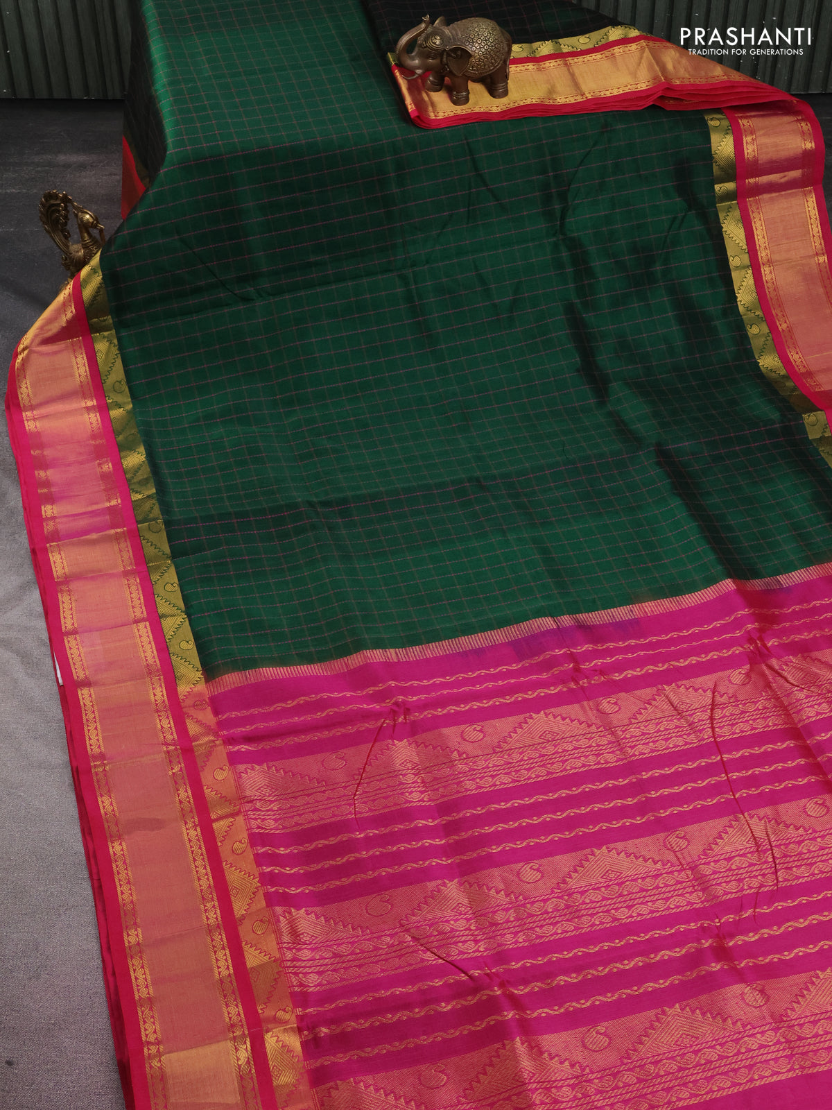 10 yards silk cotton saree green and pink with allover checked pattern and zari woven border