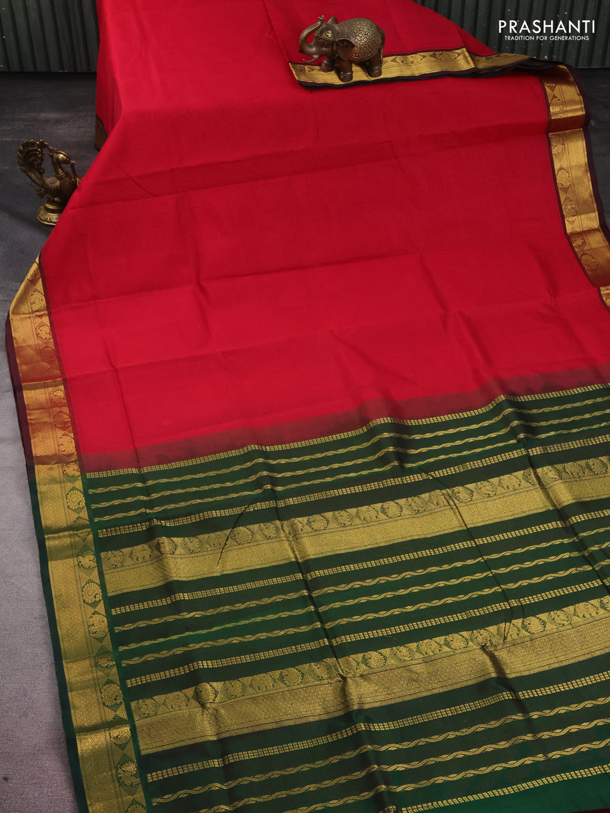 10 yards silk cotton saree reddish pink and green with plain body and zari woven border