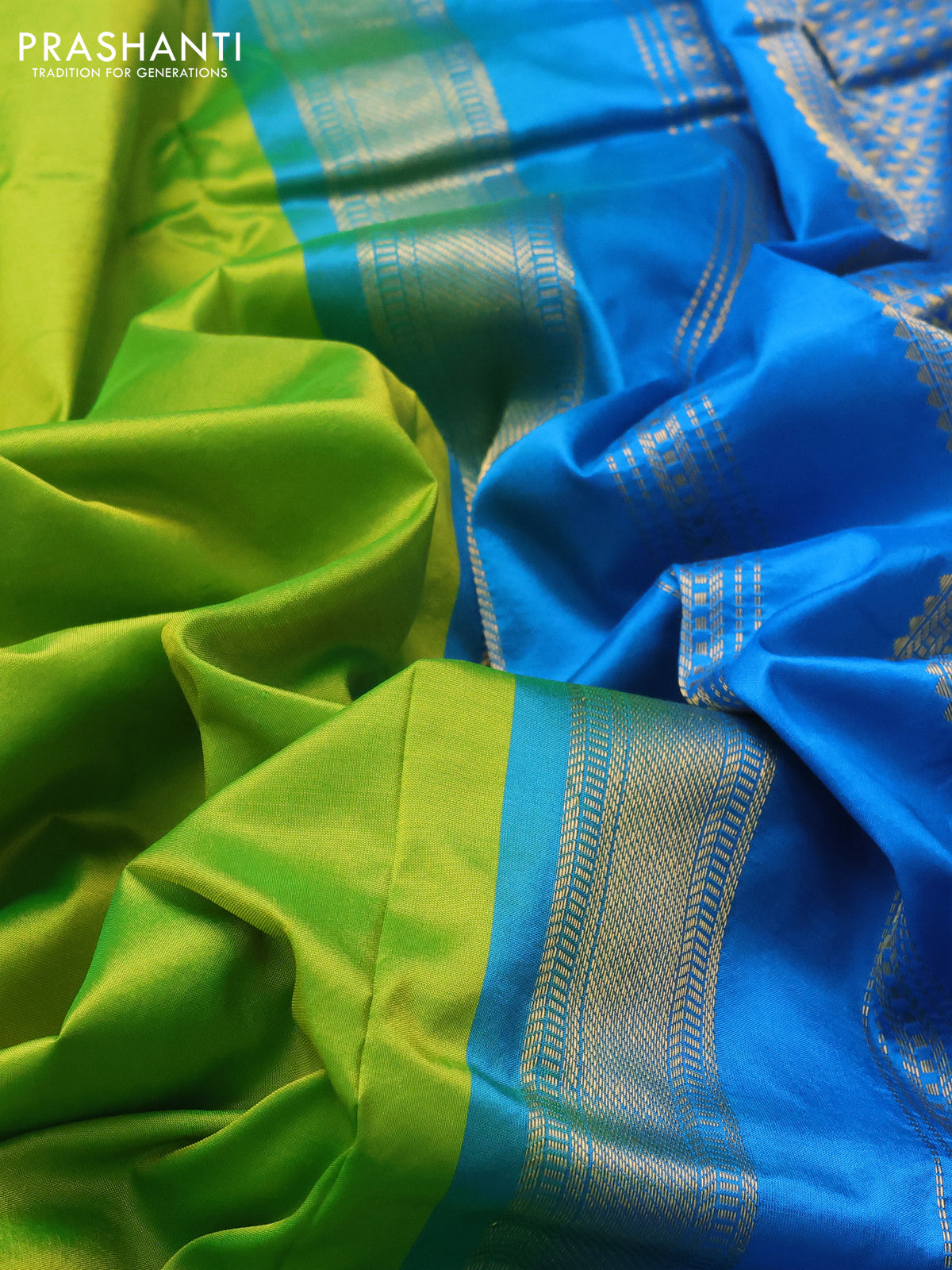 10 Yards silk saree fluorescent green and cs blue with plain body and zari woven border