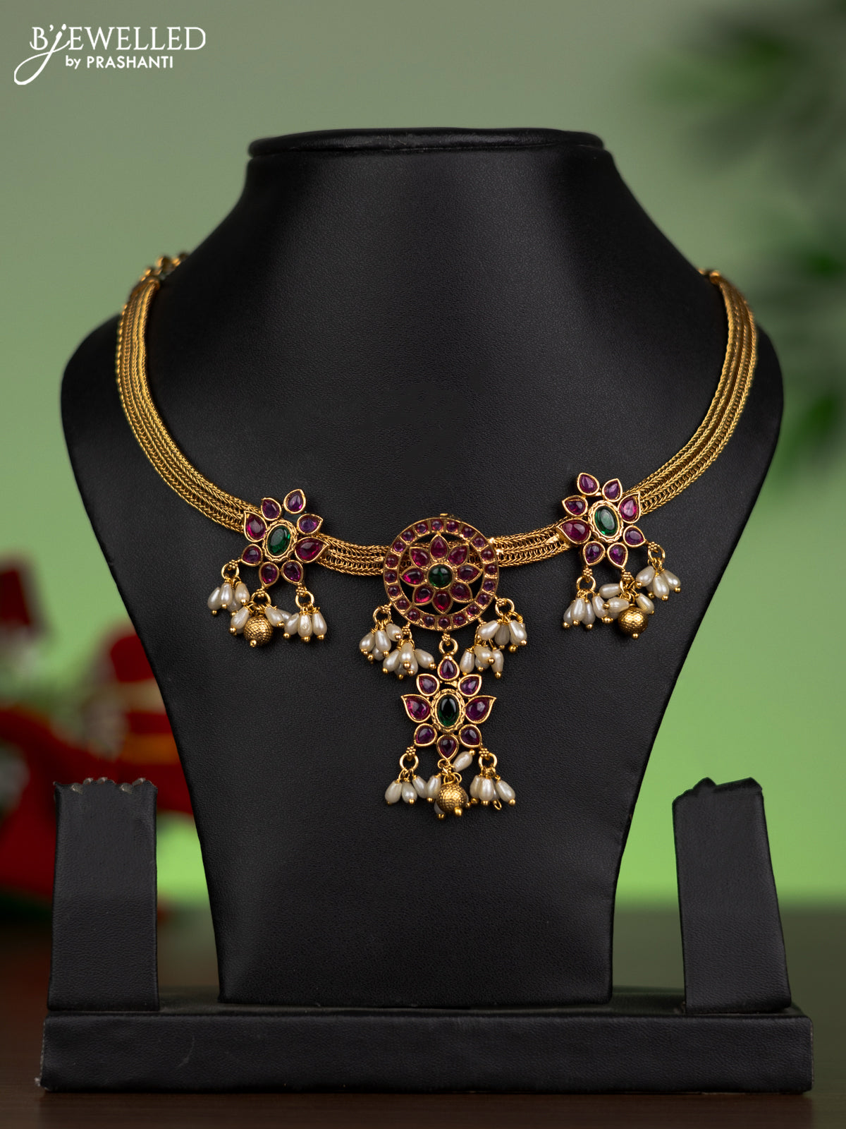 Antique attigai necklace floral design with kemp stones and pearl hangings without earring