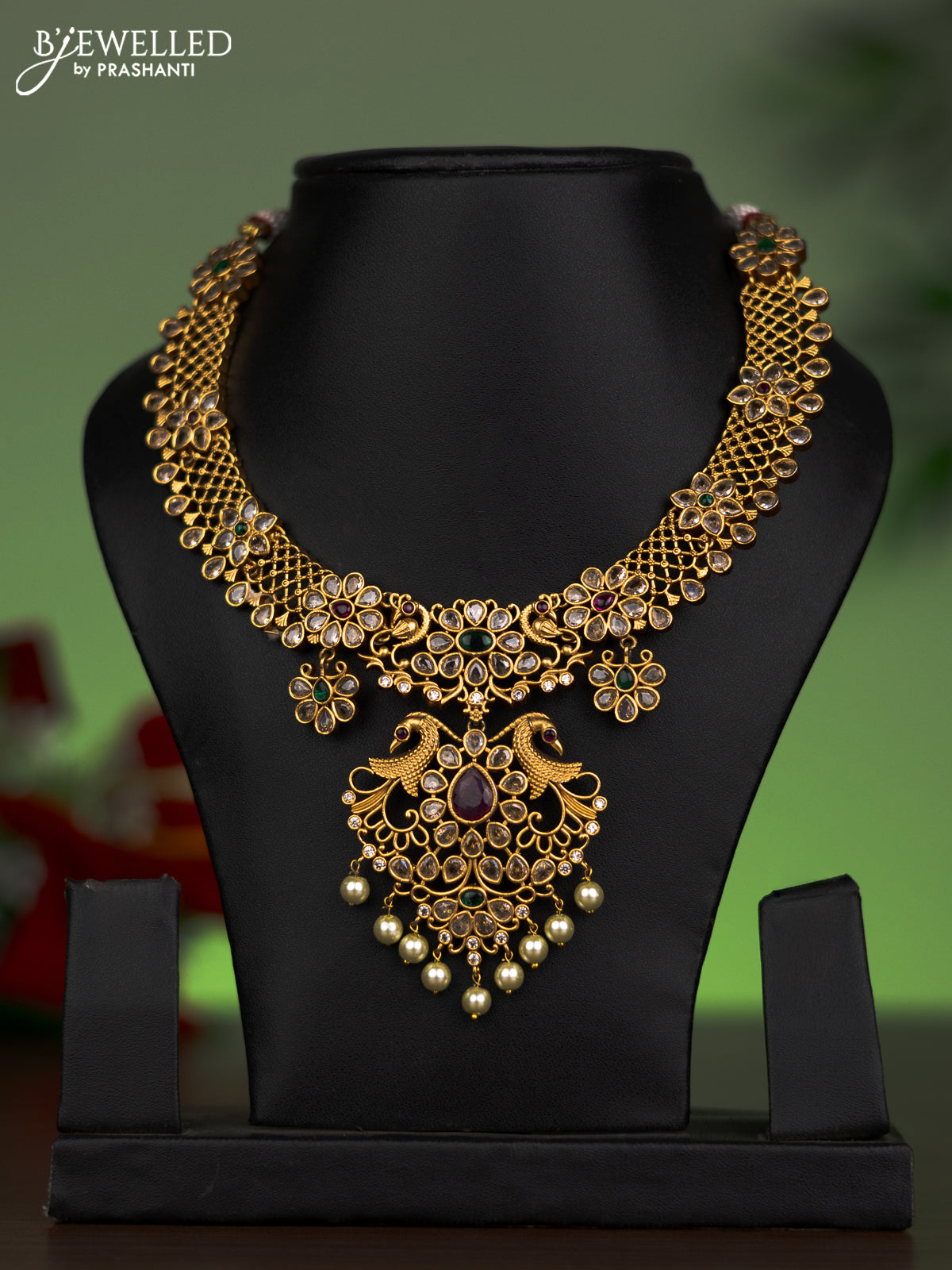 Antique attigai necklace peacock design with kemp & cz stones and pearl hanging without earring