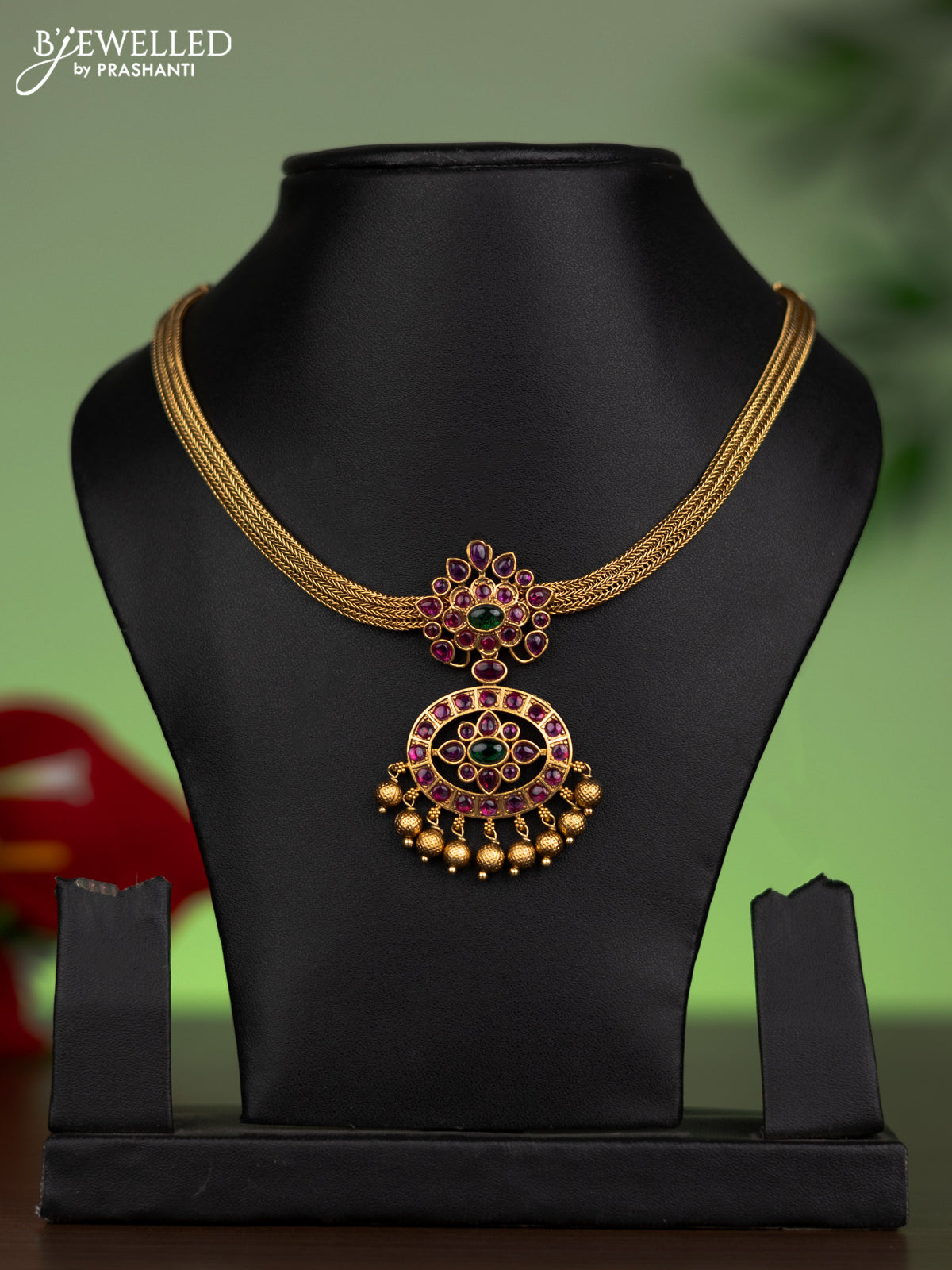 Antique attigai necklace with kemp stones and golden beads hanging without earring