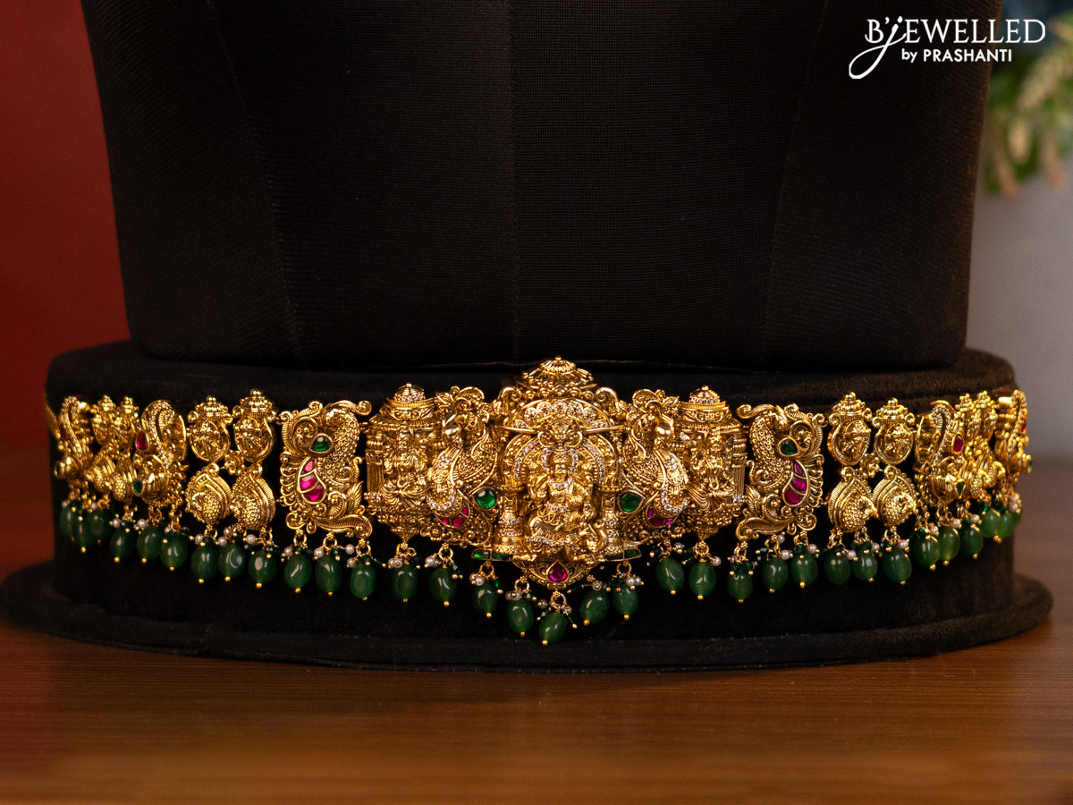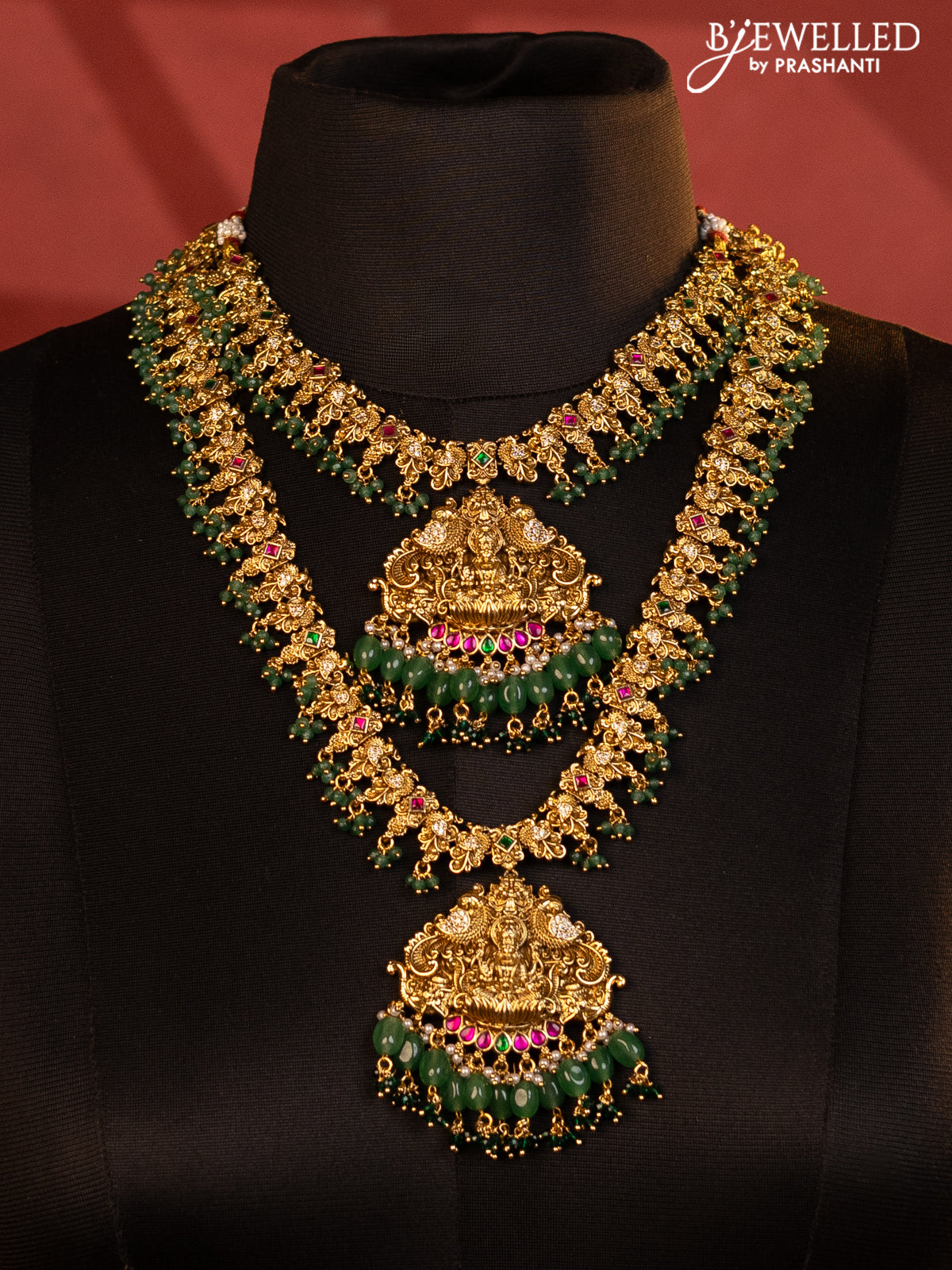 Antique bridal set lakshmi design with jadau cz stones and pearl & green beads hanging