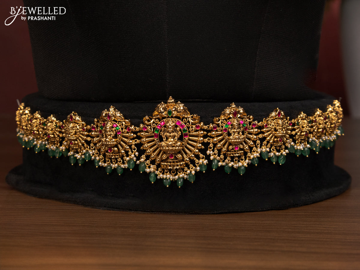 Antique bridal set lakshmi design with jadau stones and green beads hanging