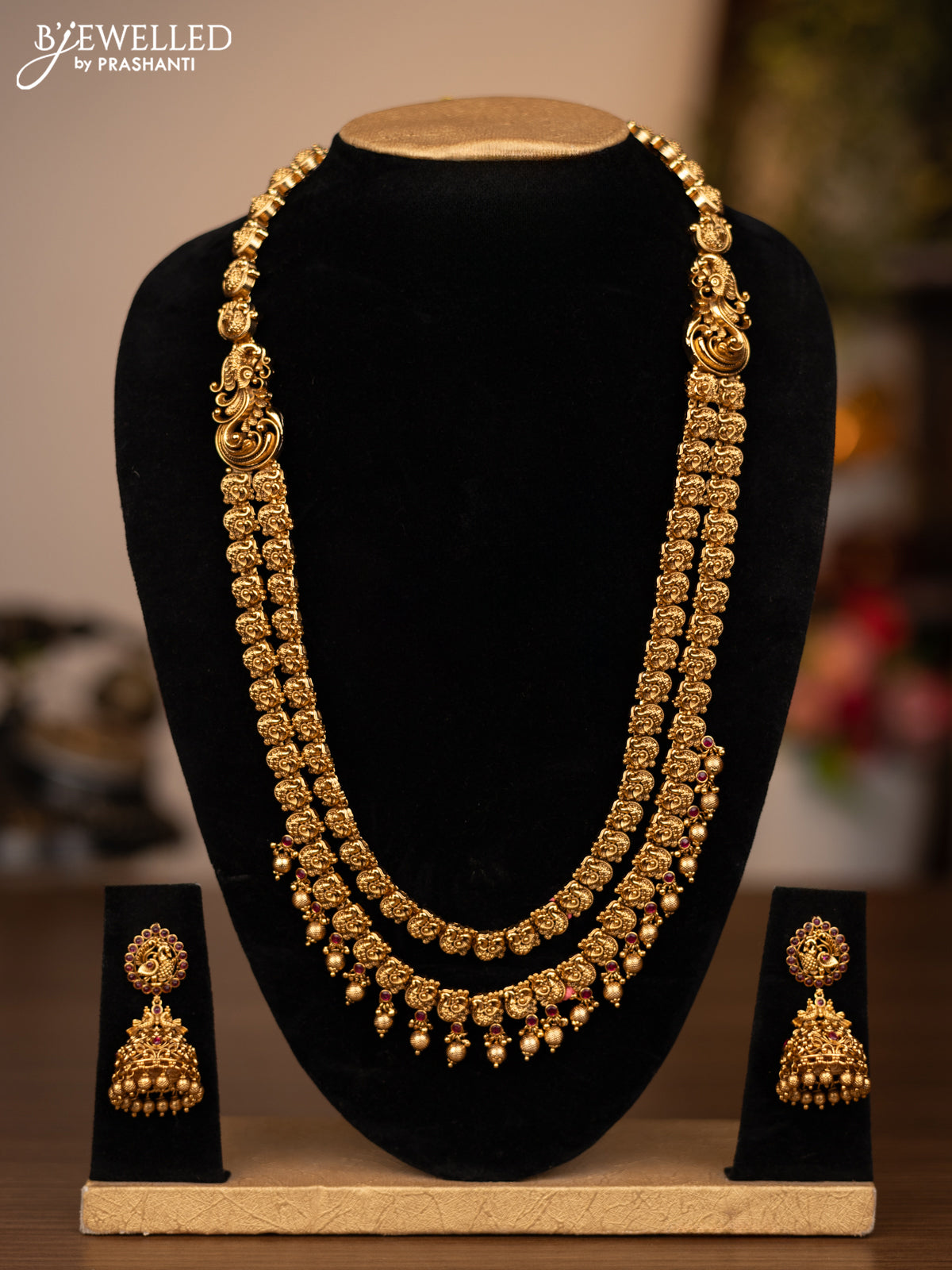 Antique double layer haaram peacock design with pink kemp stones and golden beads hanging