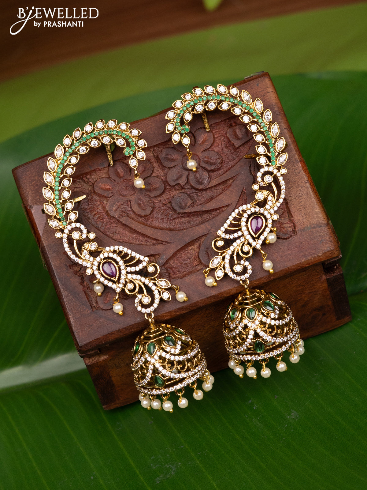 Antique earcuff jhumka peacock design with cz,kemp stones and pearl hangings
