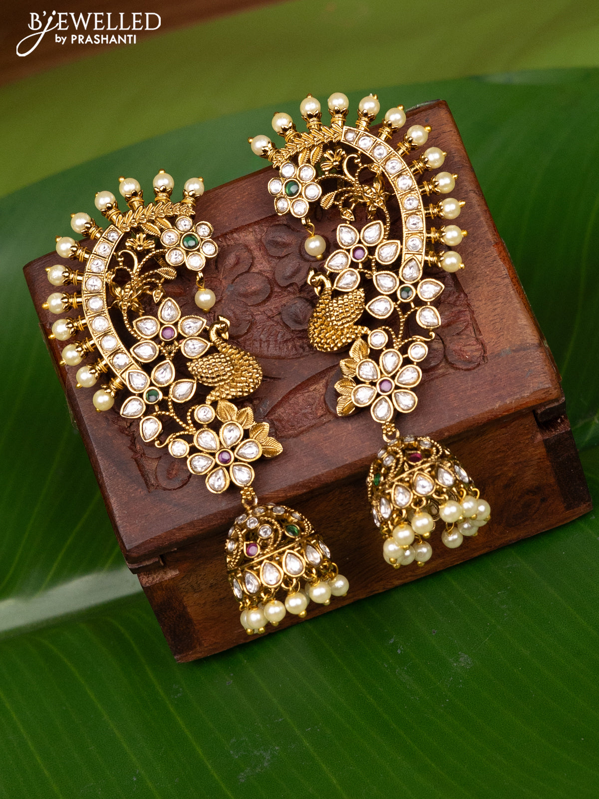 Antique earcuff jhumka peacock design with cz,kemp stones and pearl hangings