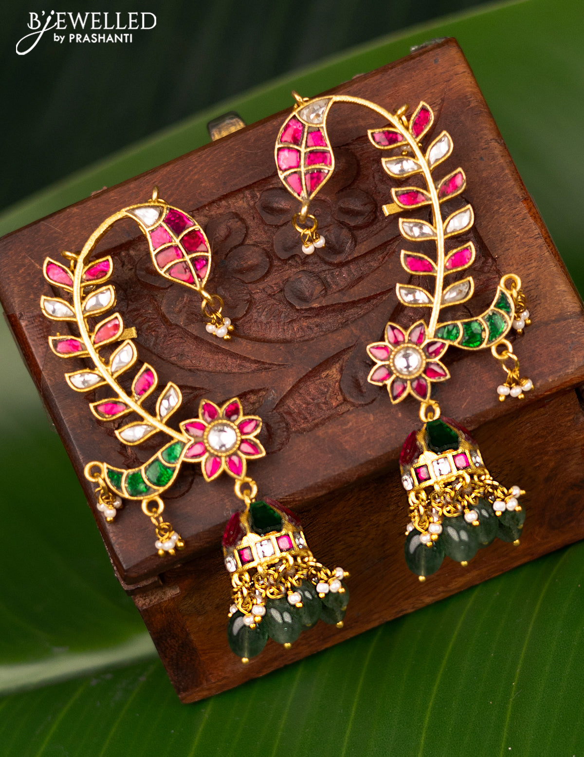 Antique earcuff jhumka with jadau kundan stones and pearl & beads hanging