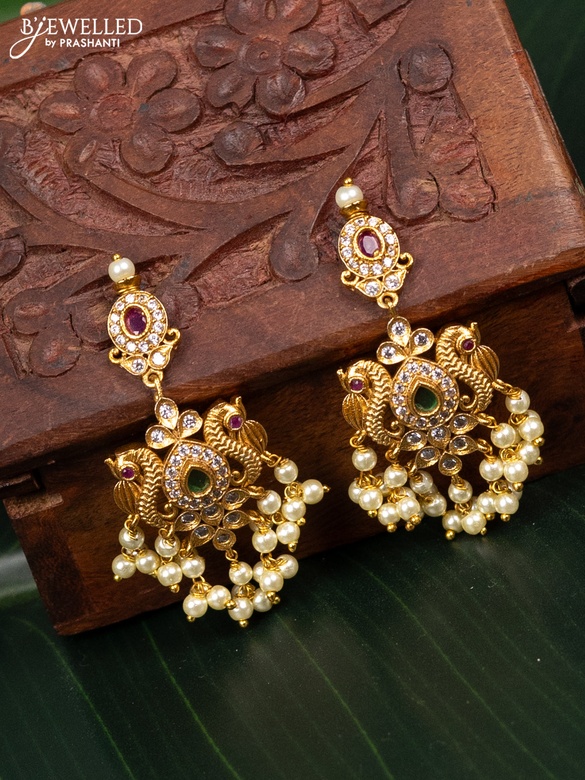 Antique earring peacock design with kemp & cz stones and pearl hangings