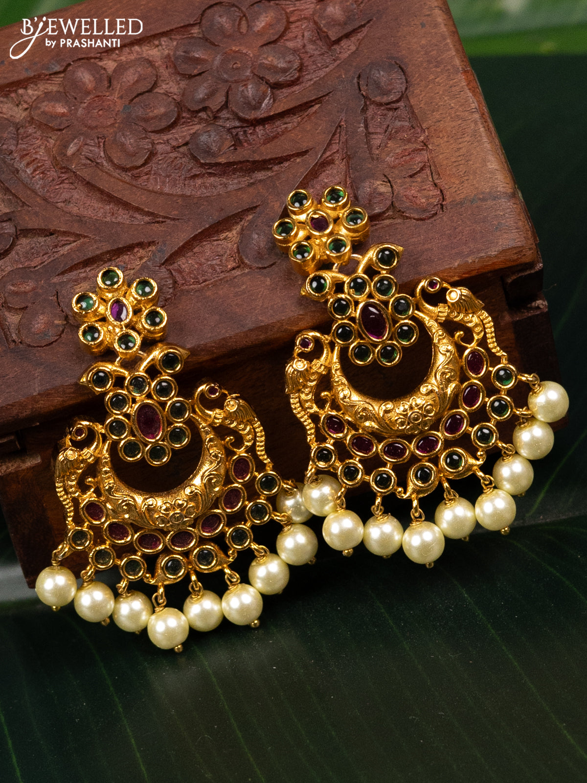 Antique earring peacock design with kemp stones and pearl hangings