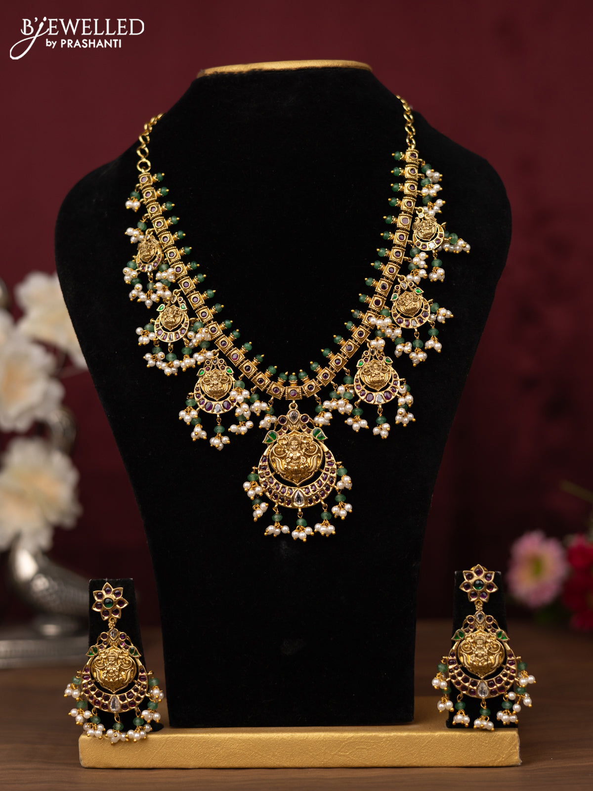 Antique guttapusalu haram lakshmi design with ruby & emerlad and cz stones with pearl hangings