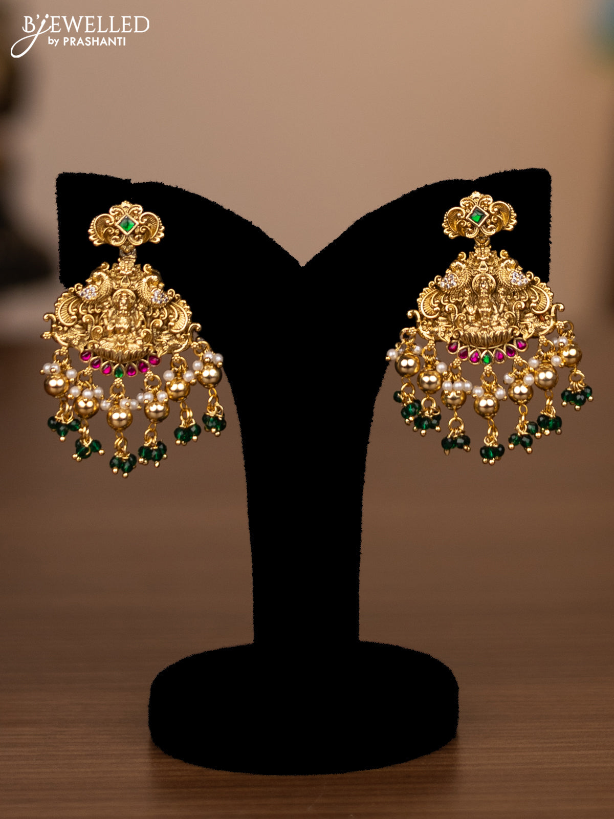 Antique haaram lakshmi design with jadau stones and green beads hanging