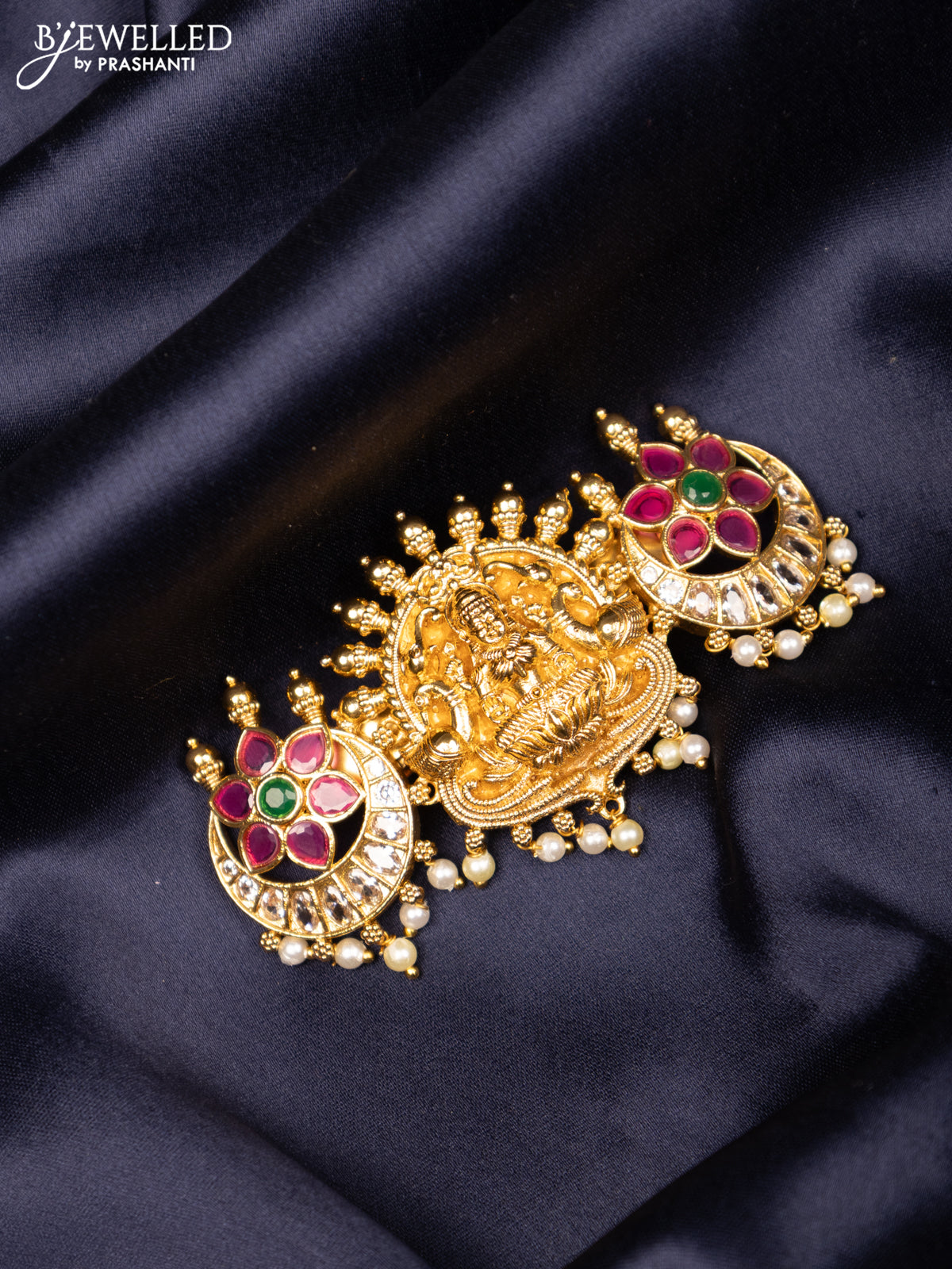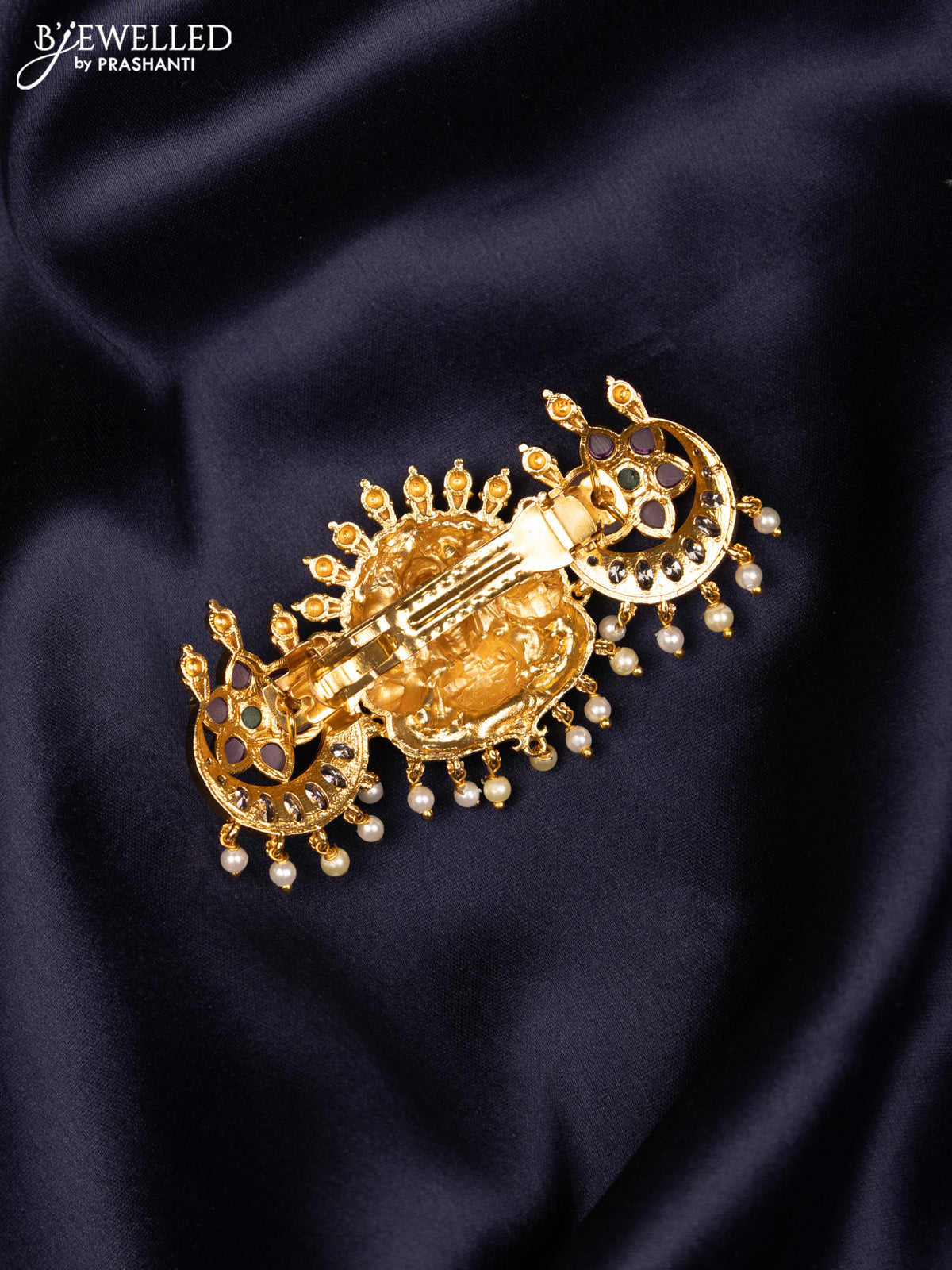 Antique hair clip medium size lakshmi design with kemp & cz stones and pearl hangings