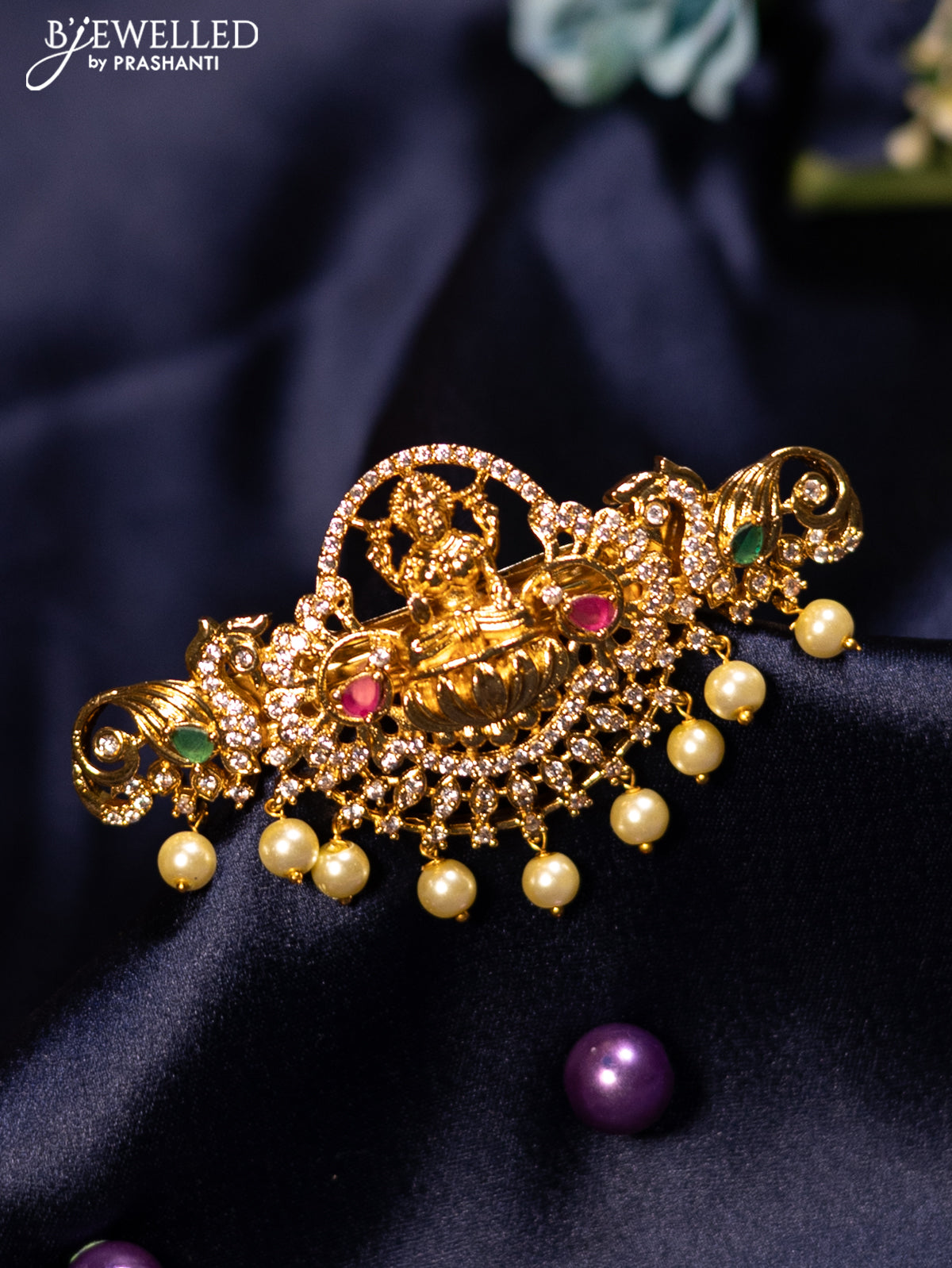 Antique hair clip medium size lakshmi design with kemp & cz stones and pearl hangings