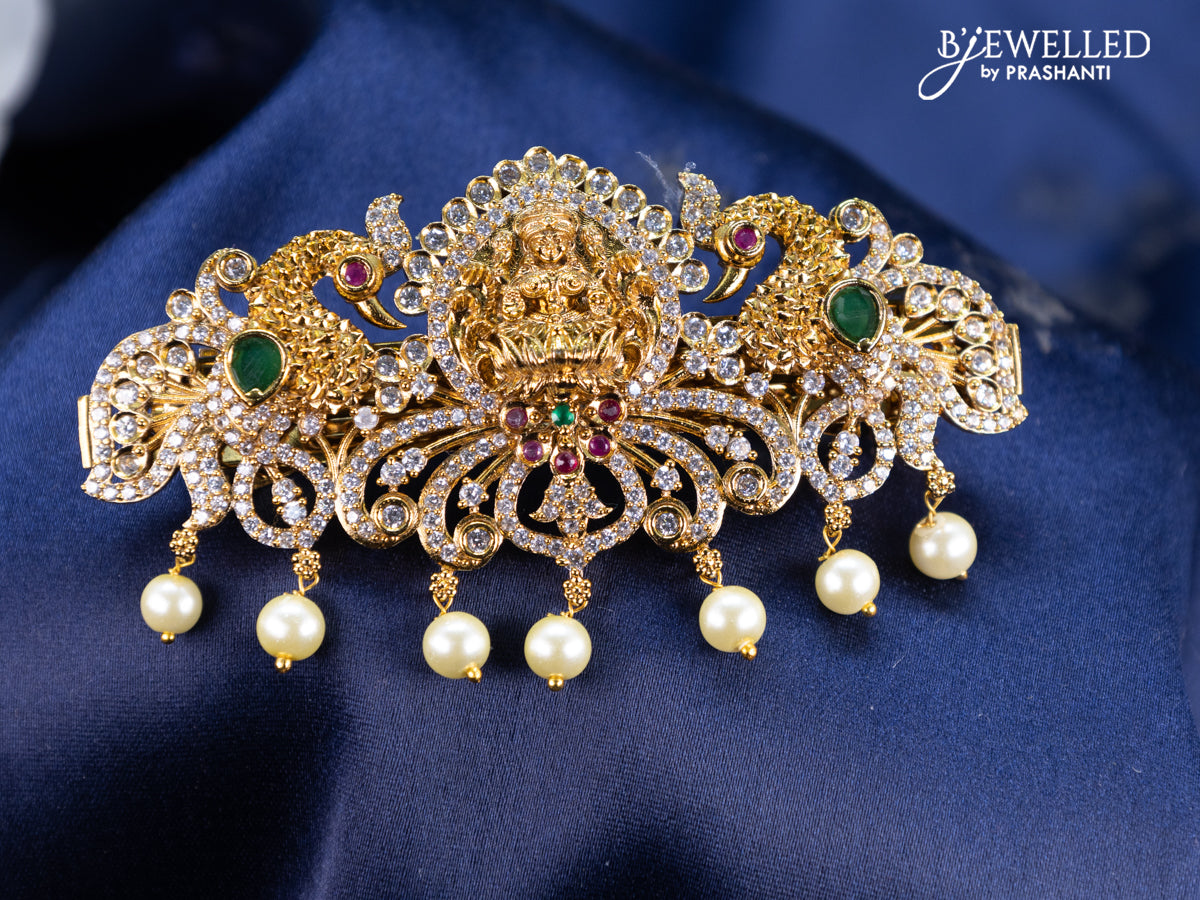 Antique hair clip medium size lakshmi & peacock design with kemp & cz stones and pearl hangings