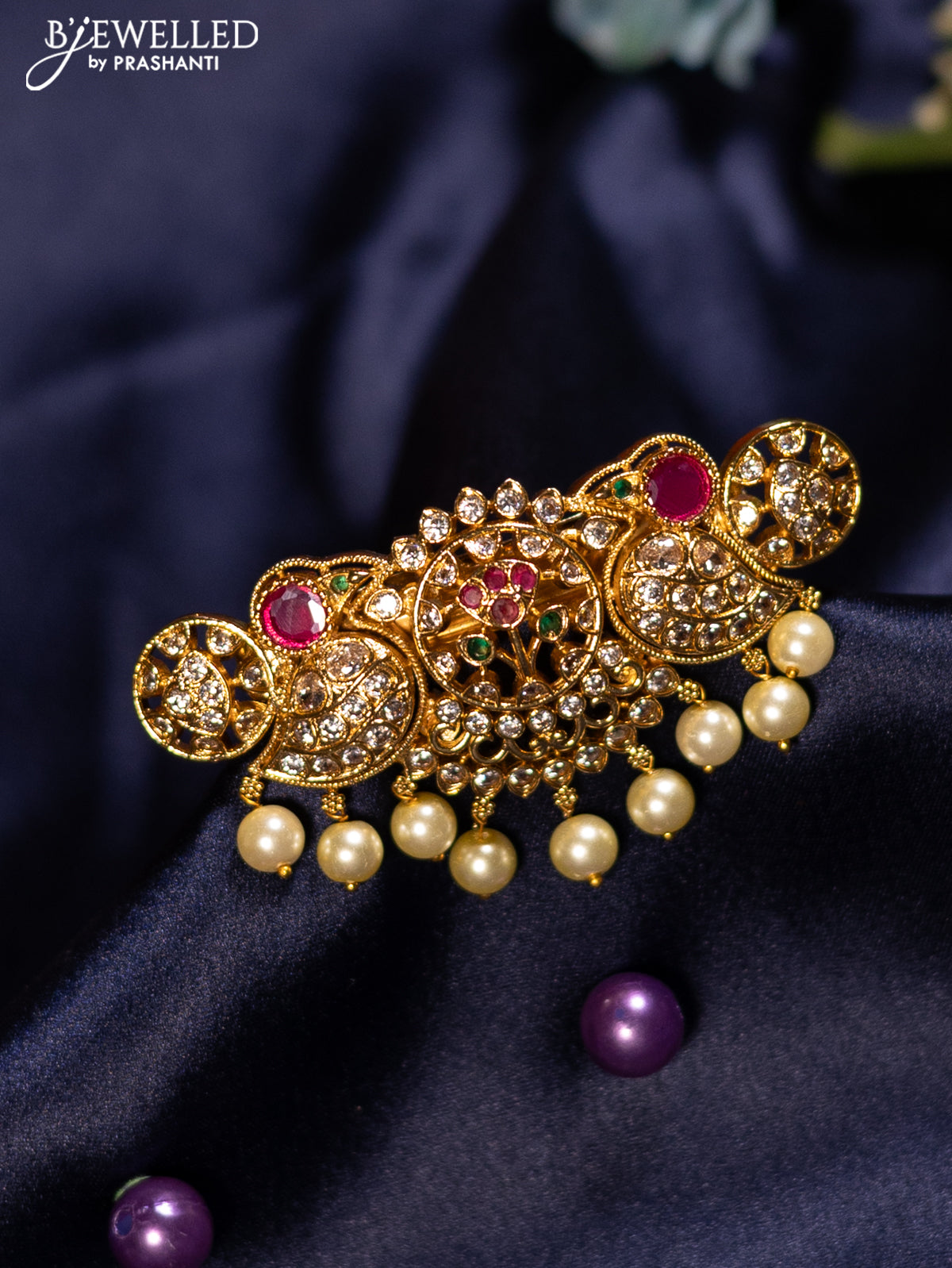 Antique hair clip medium size parrot design with kemp & cz stones and pearl hangings