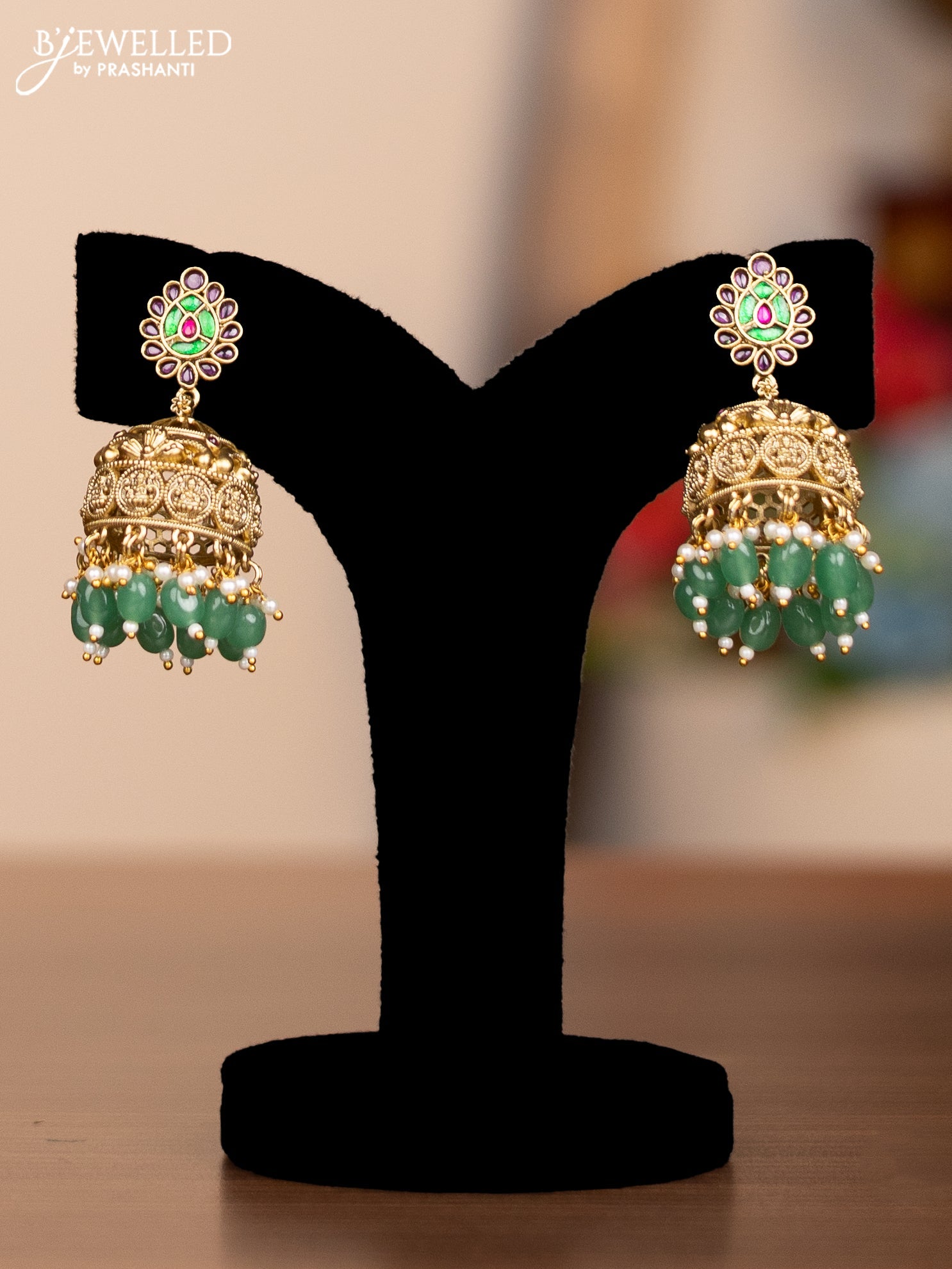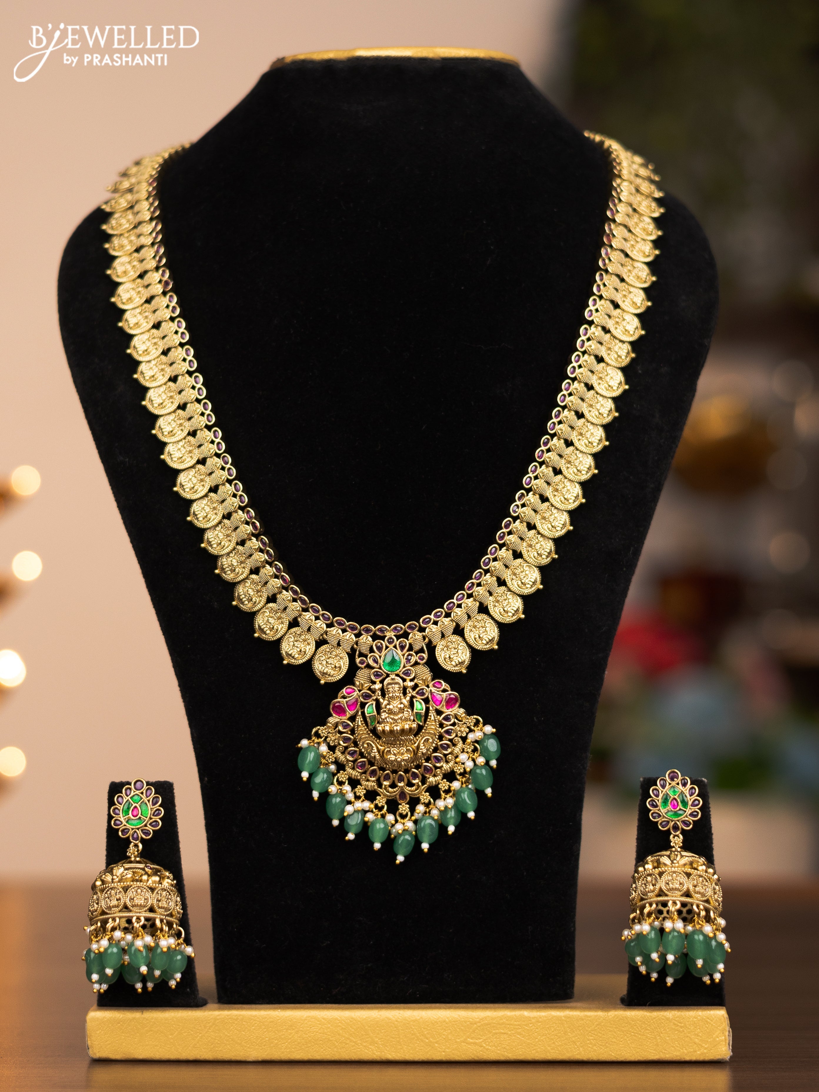Antique haram lakshmi kaasu mala design with jadau kundan and kemp stones and green beads and pearl hangings