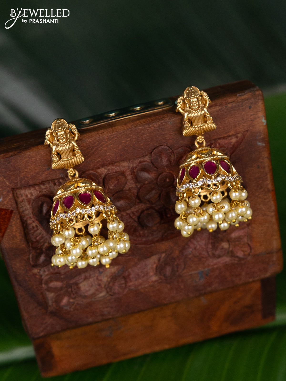 Antique jhumka lakshmi design with pink kemp & cz stones and pearl hanging