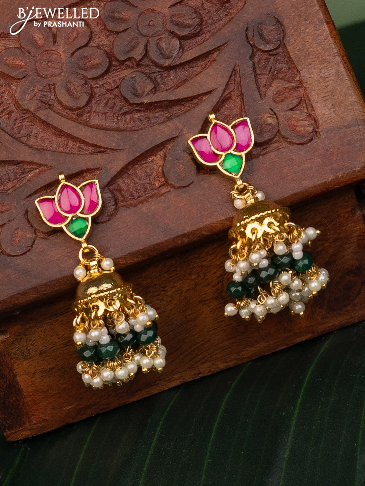 Antique jhumka lotus design with kemp pachi kundan stones and pearl & green beads hanging