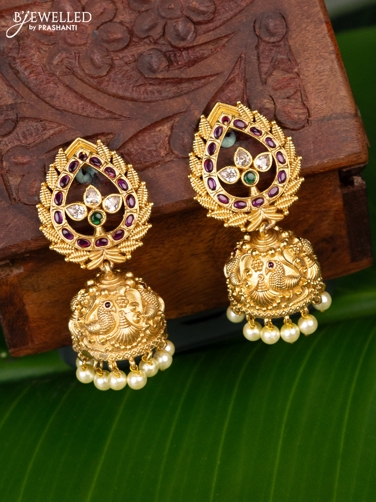 Antique jhumka peacock design with kemp & cz stones and pearl hangings