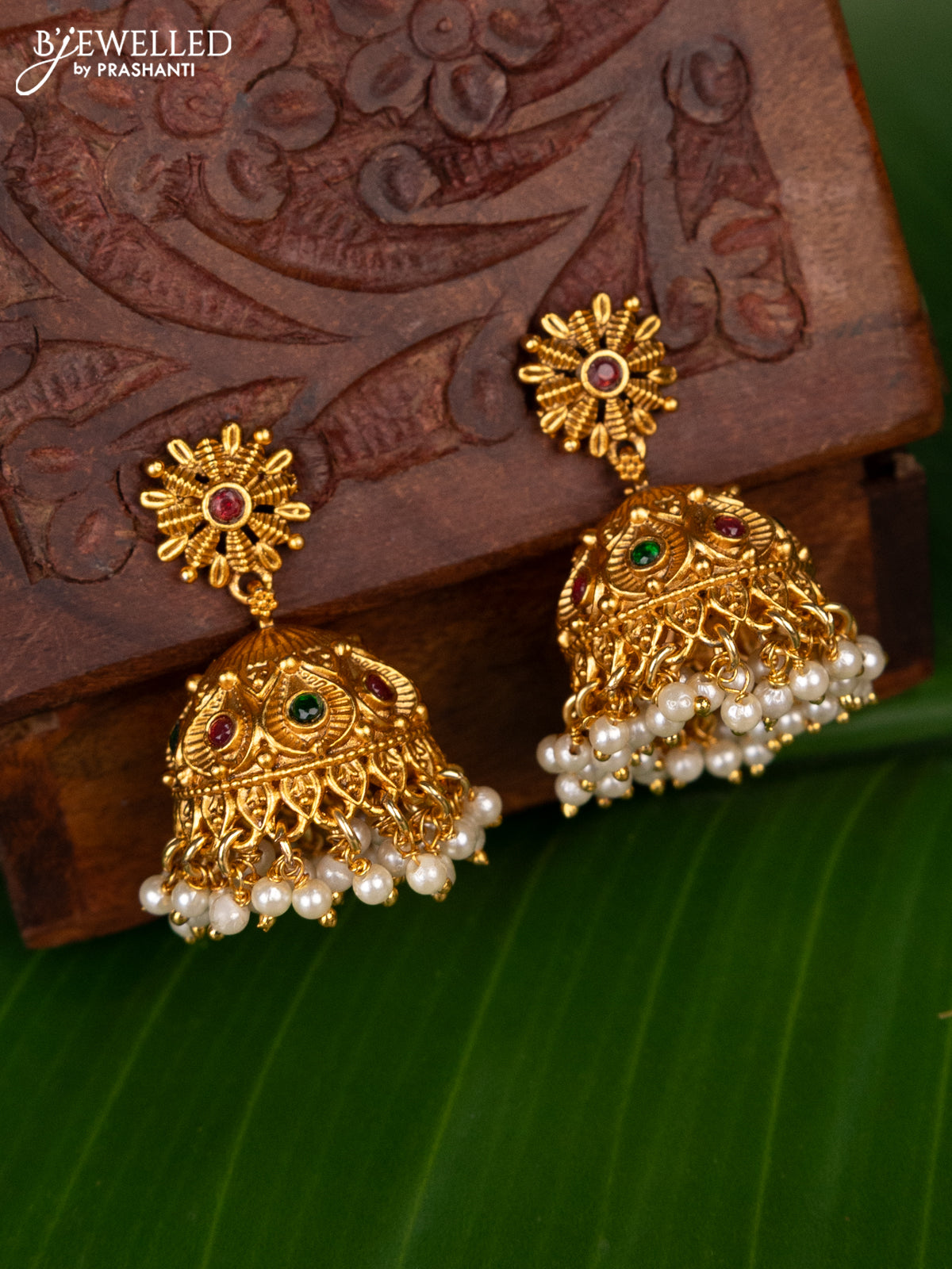 Antique jhumka with kemp stones and pearl hanging