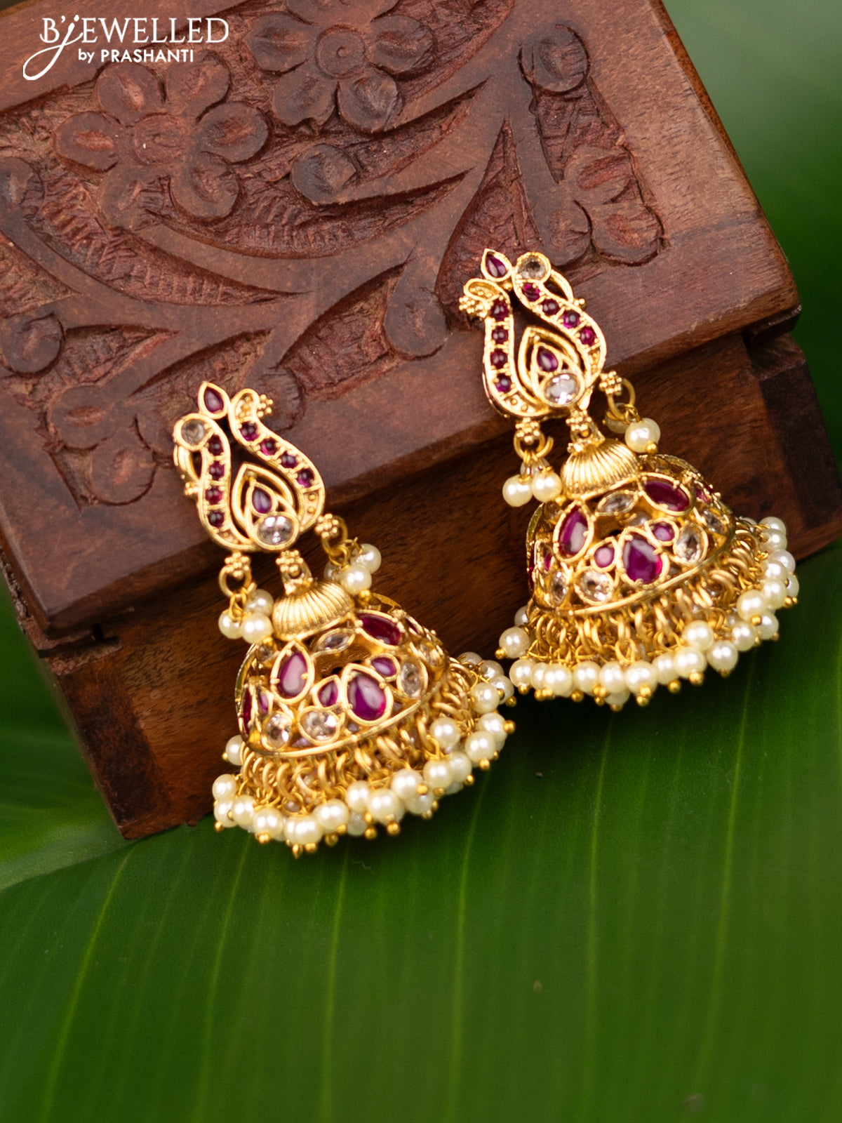 Antique jhumka with pink kemp & cz stones and pearl hangings