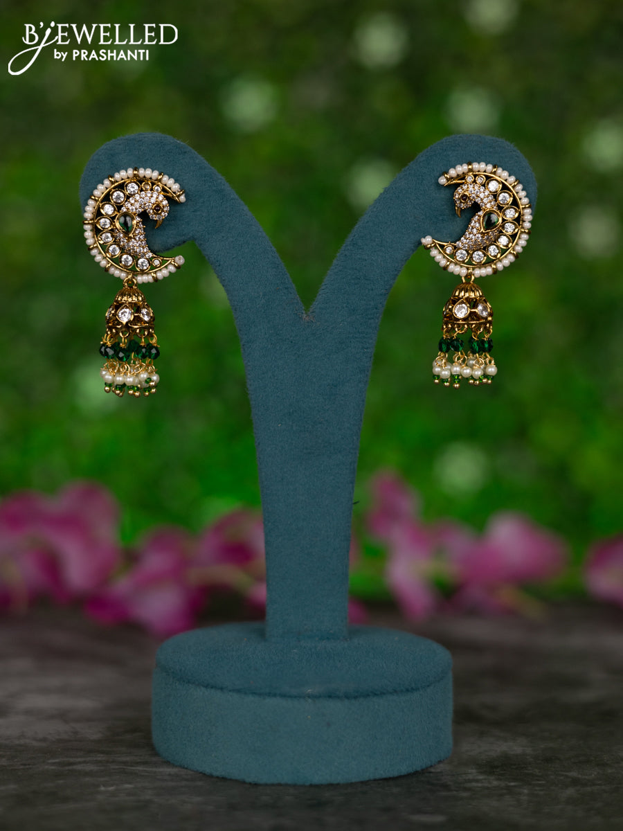 Antique jhumkas peacock design with kemp & cz stones and pearl & green beads hangings
