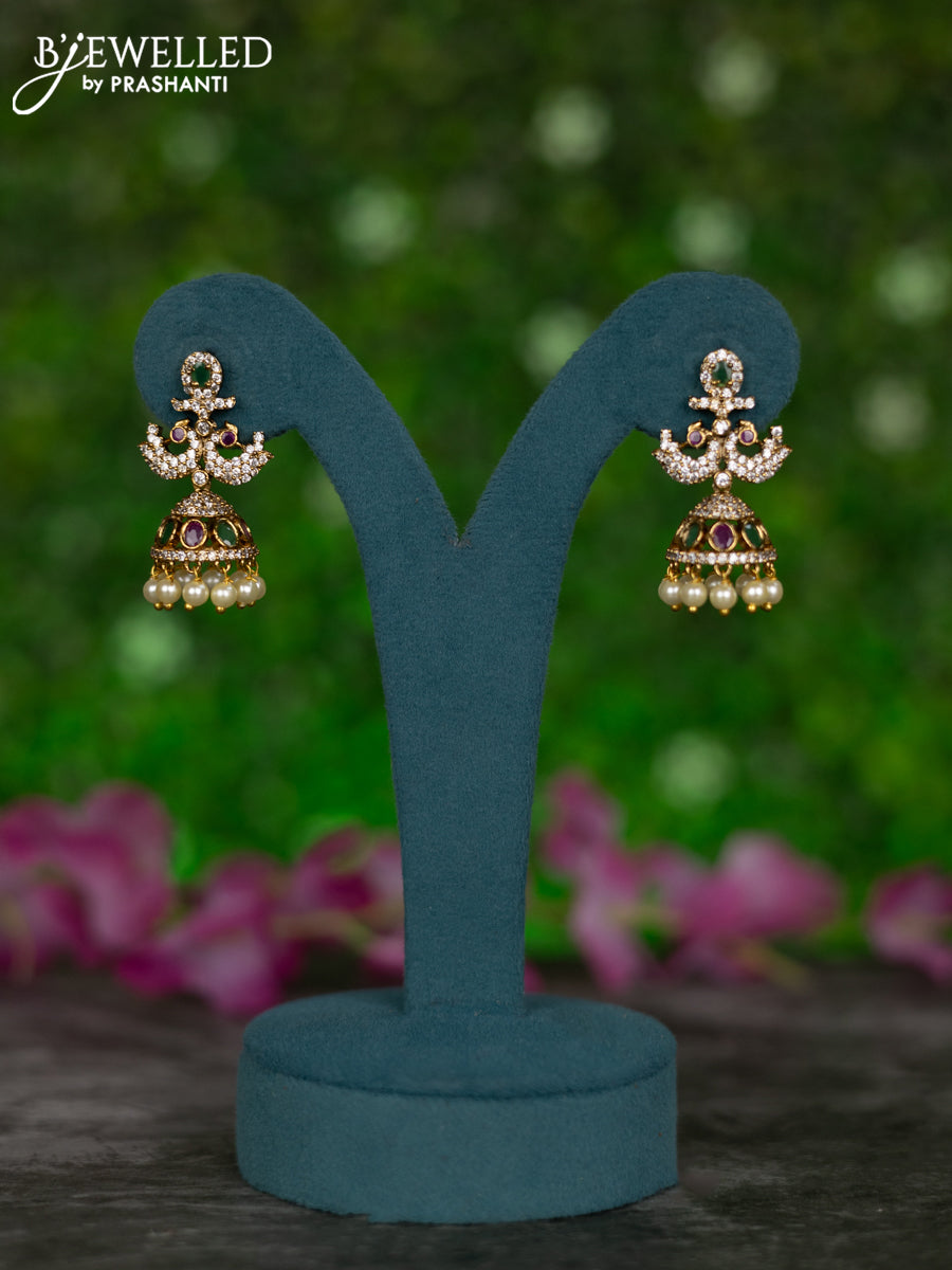 Antique jhumkas peacock design with kemp & cz stones and pearl hangings