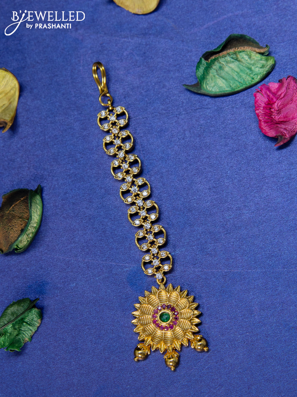 Antique maang tikka floral design with kemp & cz stones and golden beads