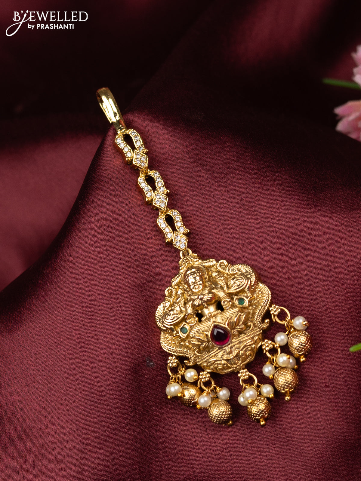 Antique maang tikka lakshmi design with kemp & cz stones and golden beads hangings