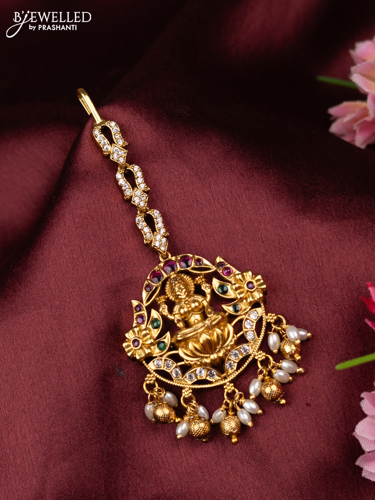 Antique maang tikka lakshmi design with kemp & cz stones and golden beads hangings