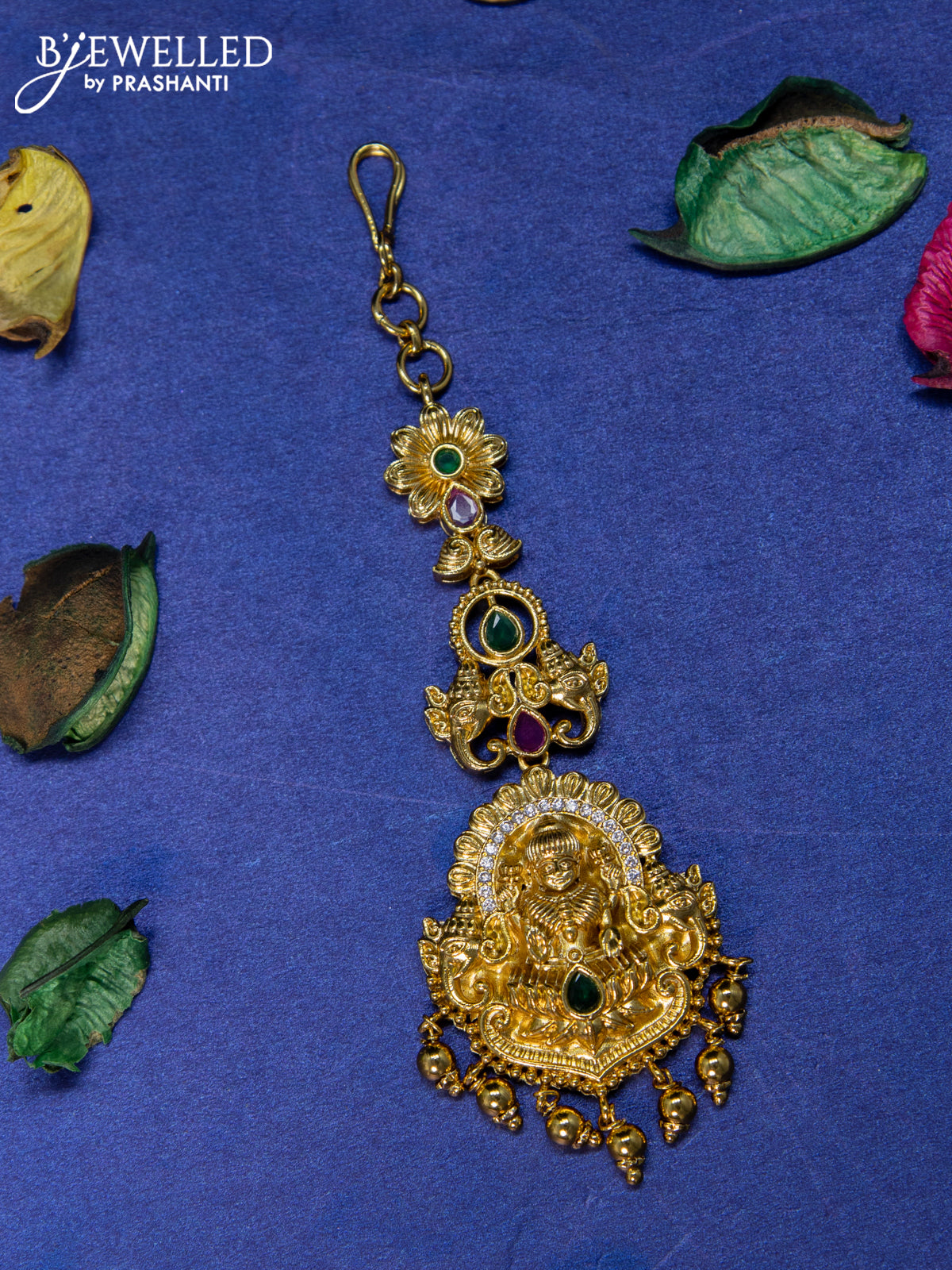 Antique maang tikka lakshmi design with kemp & cz stones and golden beads hangings