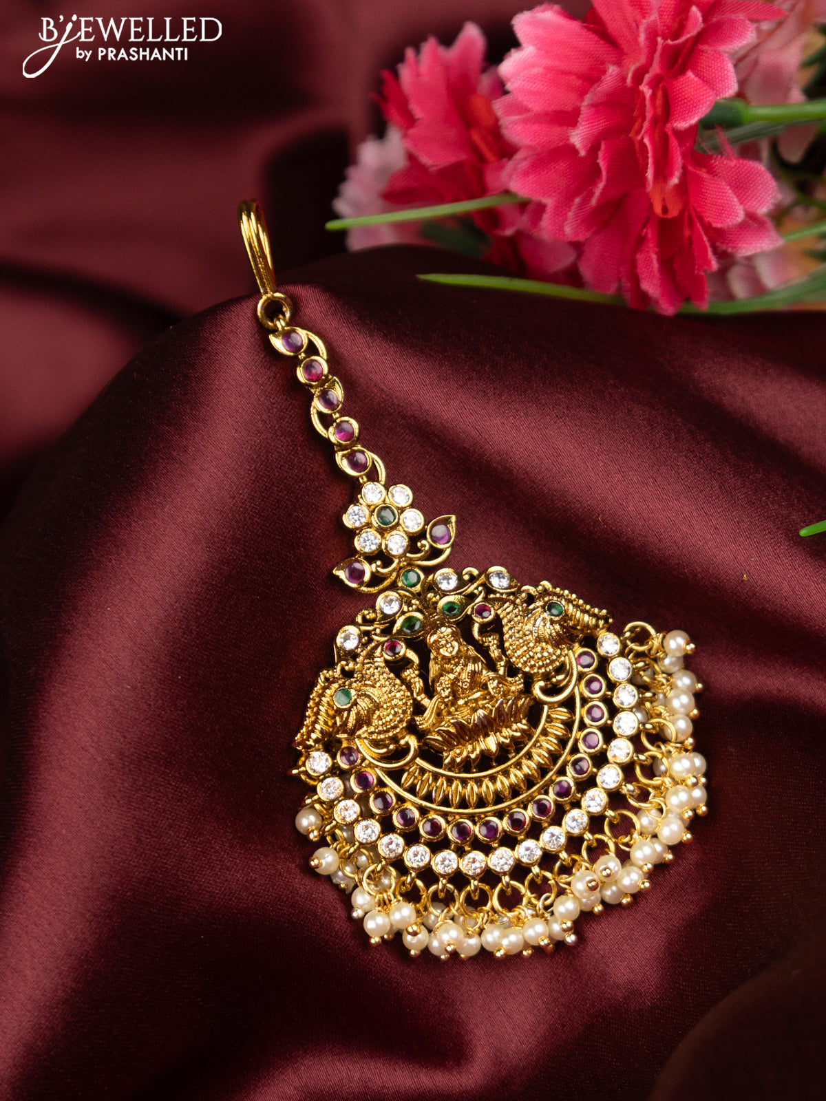 Antique maang tikka lakshmi design with kemp & cz stones and pearl hangings