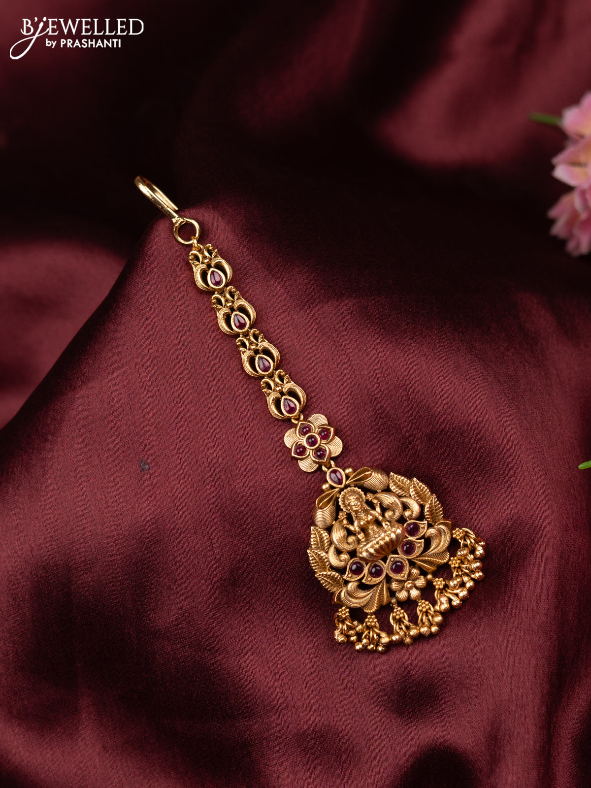 Antique maang tikka lakshmi design with pink kemp and golden beads hangings