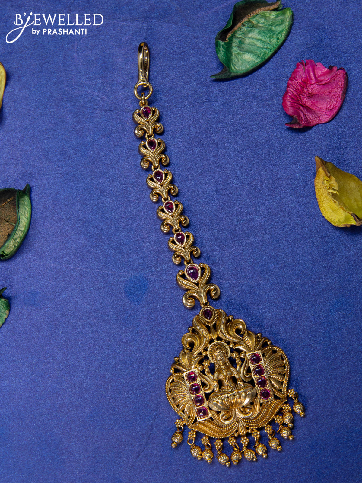 Antique maang tikka lakshmi design with pink kemp stones and golden beads hangings