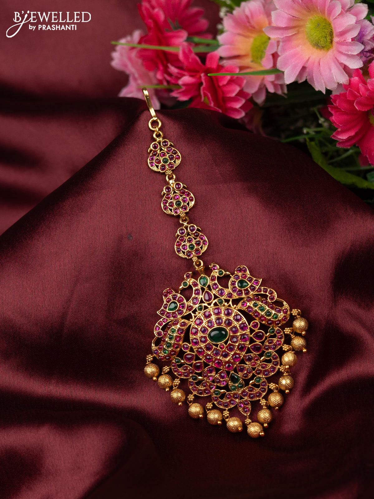 Antique maang tikka peacock design with kemp and golden beads hangings
