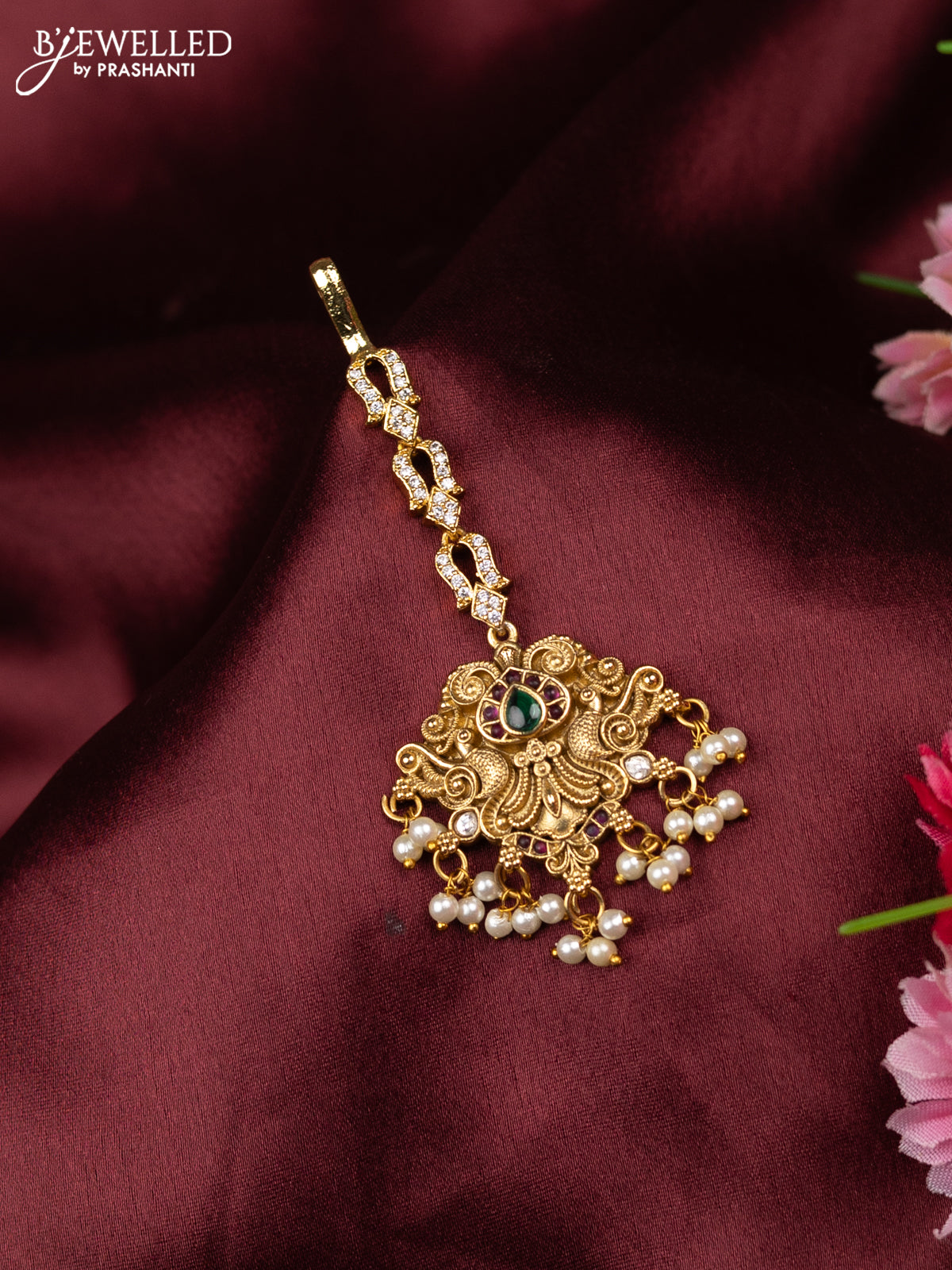 Antique maang tikka peacock design with kemp & cz stones and pearl hangings