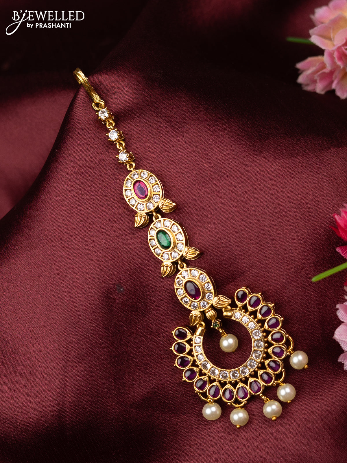 Antique maang tikka with kemp & cz stones and golden beads hangings