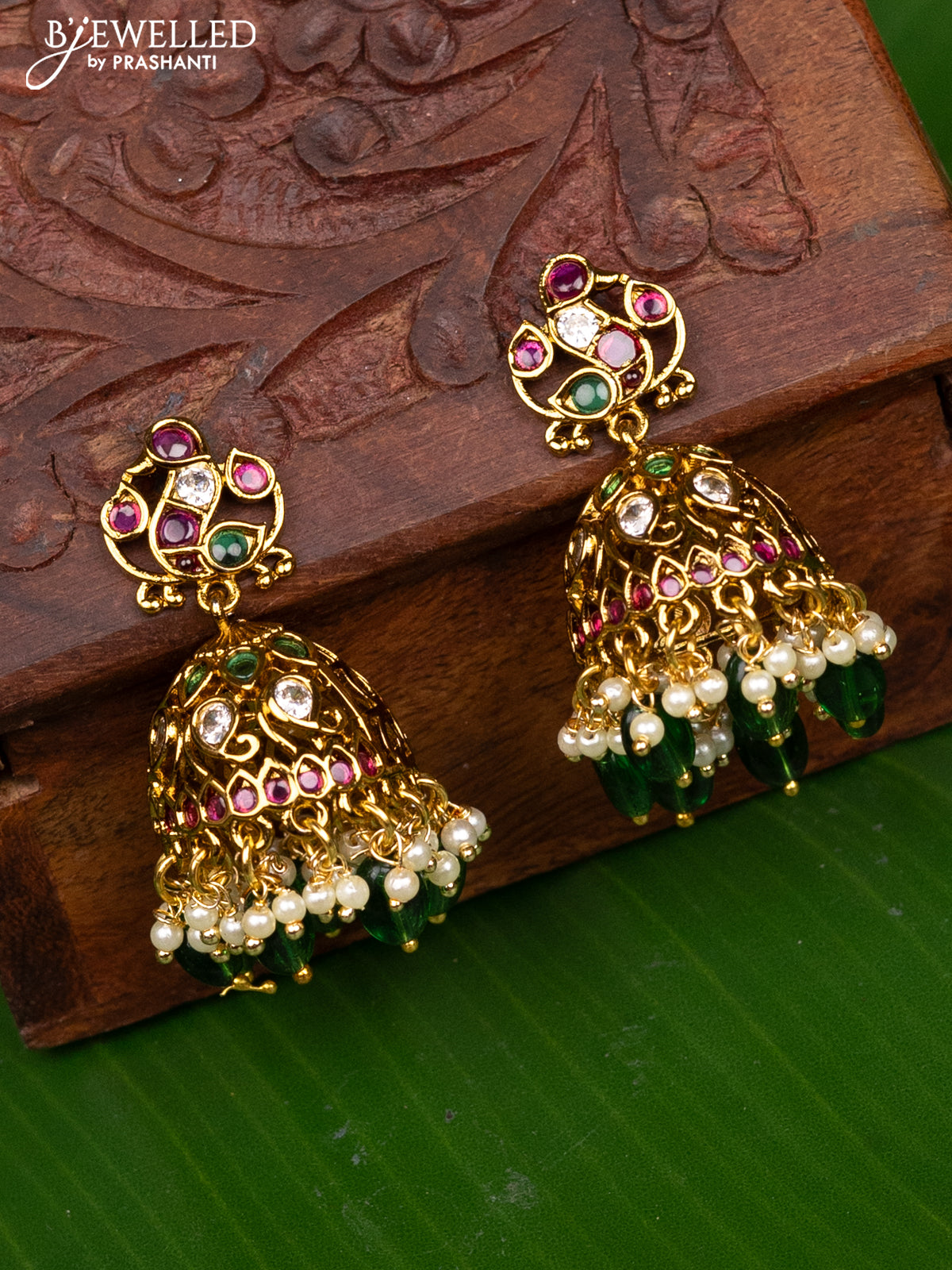 Antique medium size jhumka peacock design with kemp & cz stones and pearl hangings