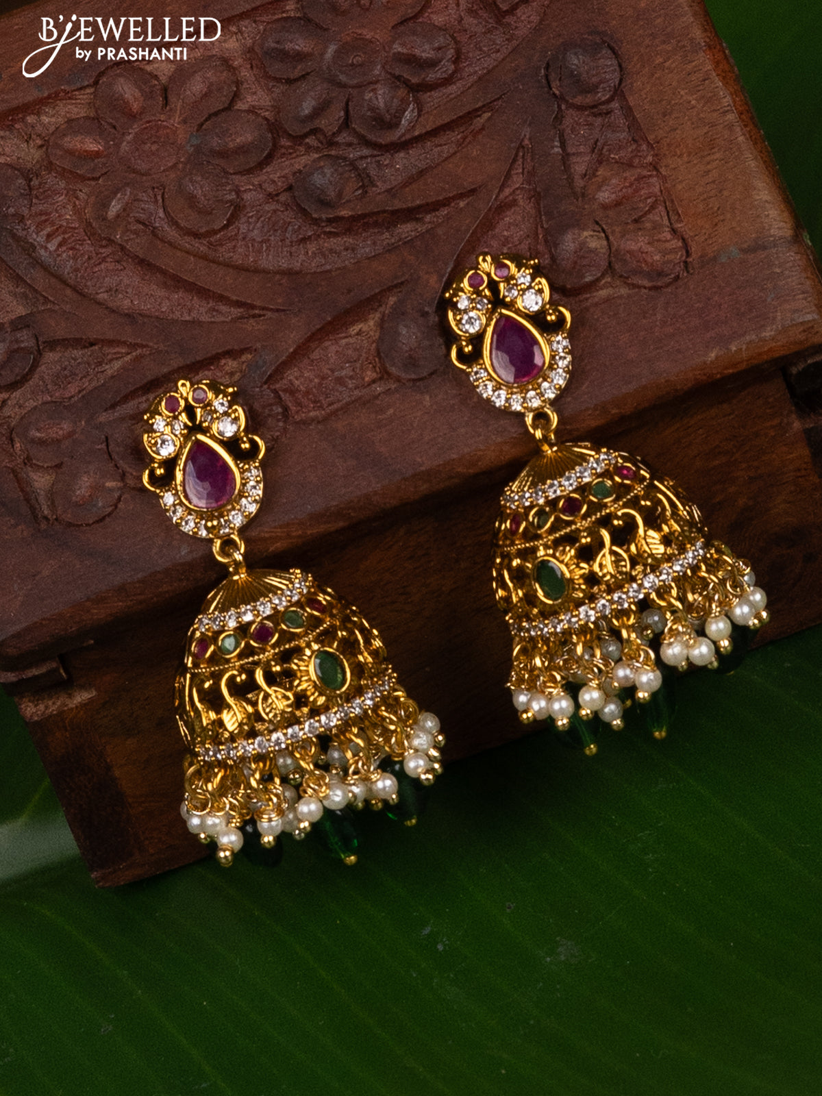 Antique medium size jhumka with kemp & cz stones and pearl hangings