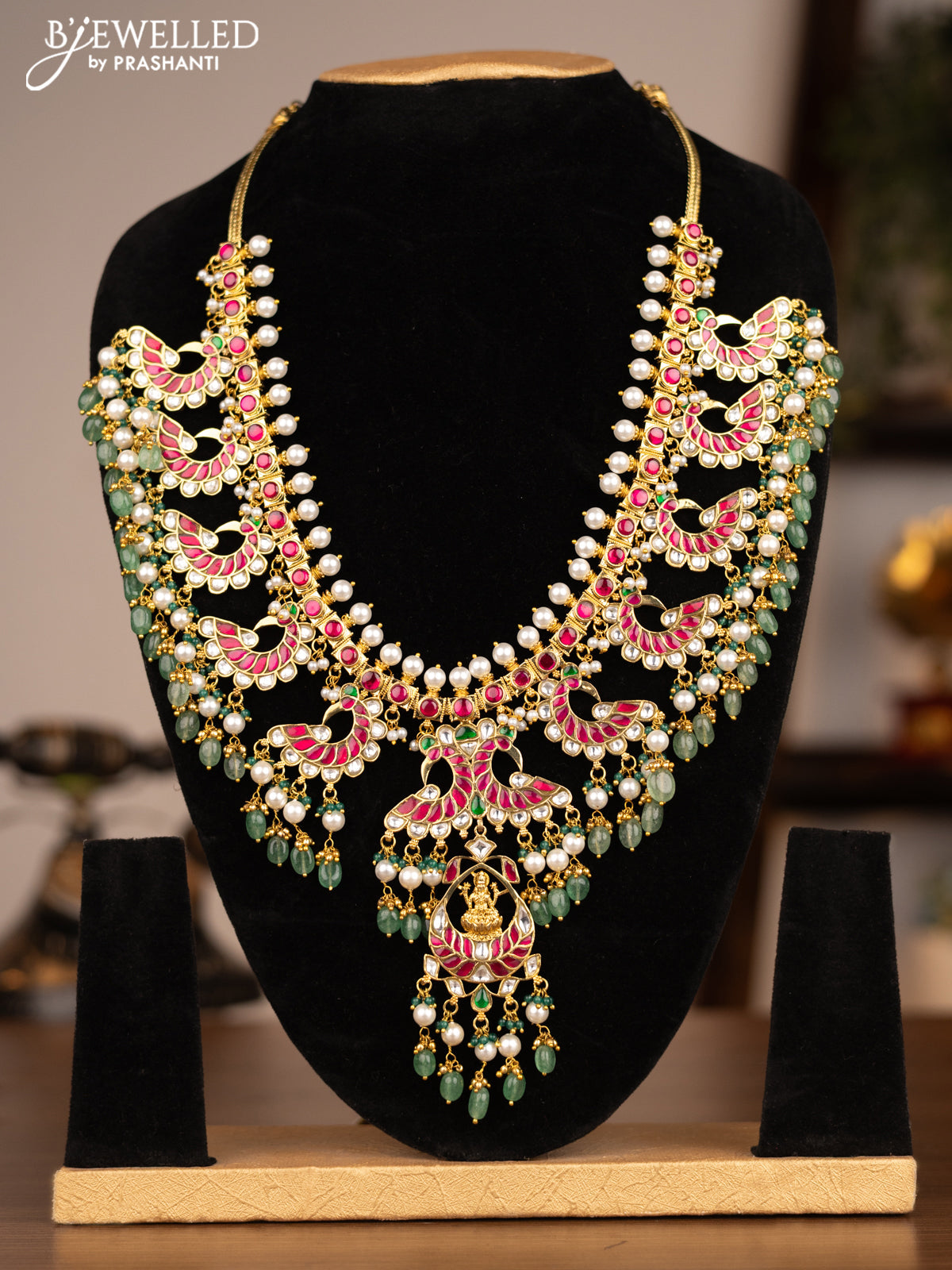 Antique necklace lakshmi & peacock design with jadau kundan stones and pearl & beads hanging without earrings