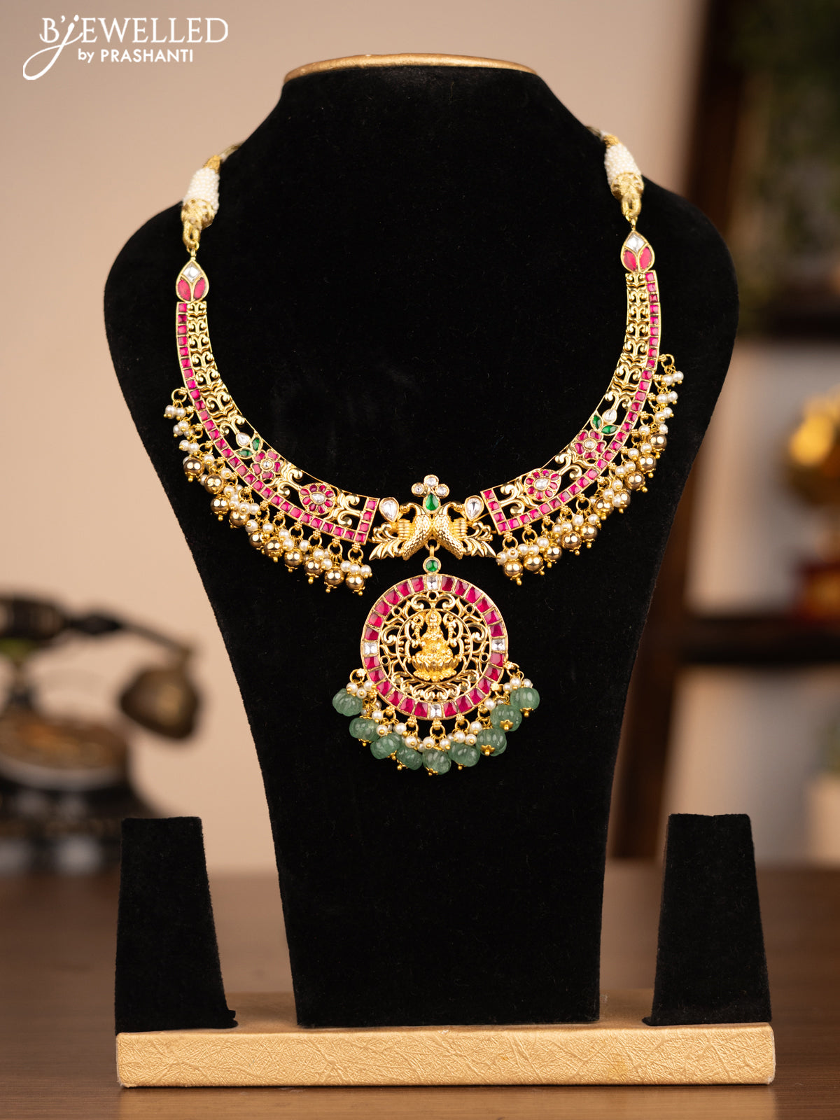 Antique necklace lakshmi pendant with jadau kundan stones and pearl & pumpkin beads hanging without earrings