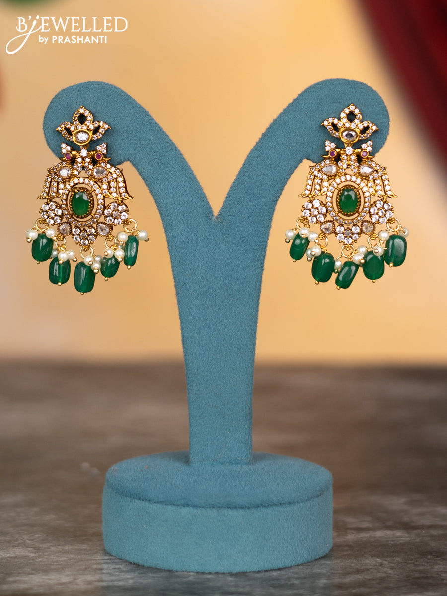 Antique necklace peacock design with green kemp & cz stones and pearl & green beads hangings