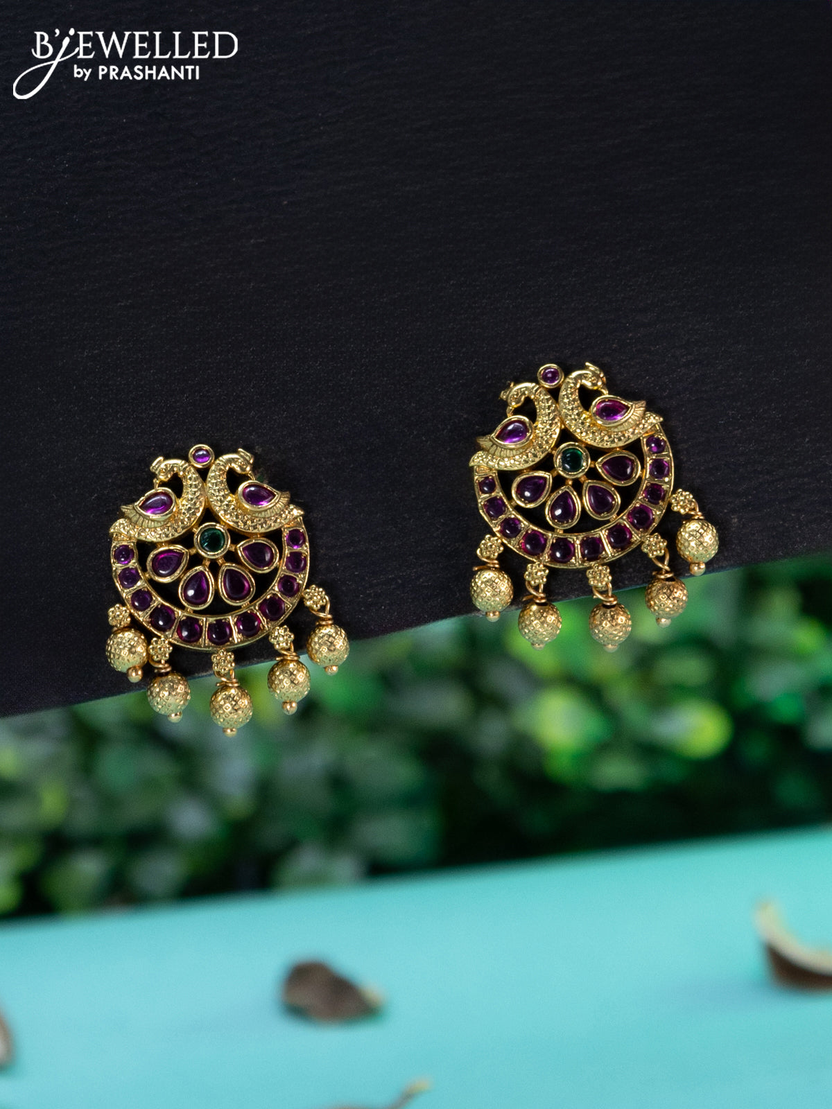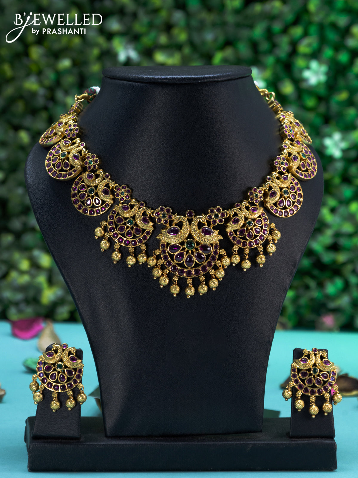 Antique necklace peacock design with kemp stones and golden beads hangings